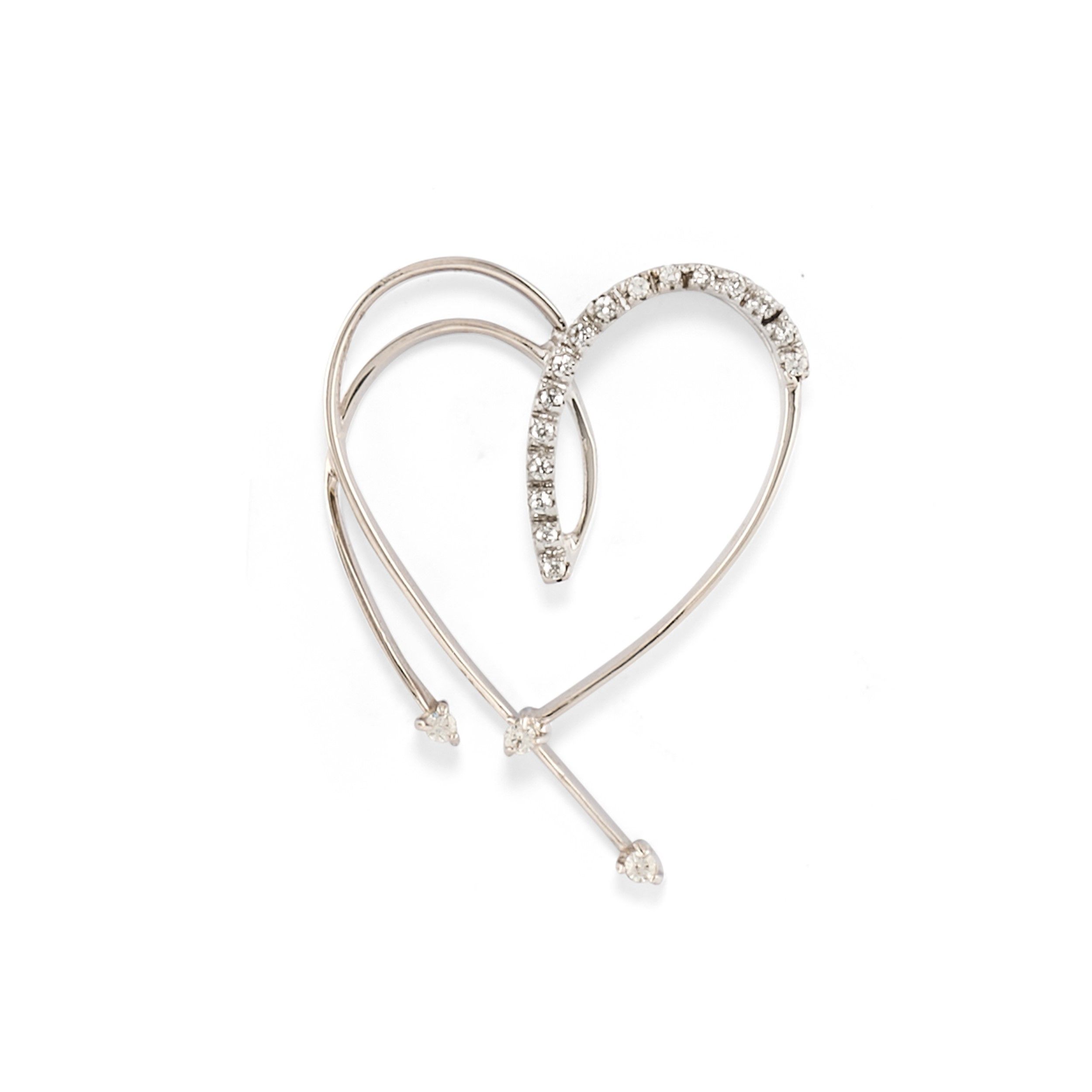 spilla a forma di cuore con diamanti taglio brillante e anello a fascia con al centro motivo a fiore in diamanti taglio huit-huit.