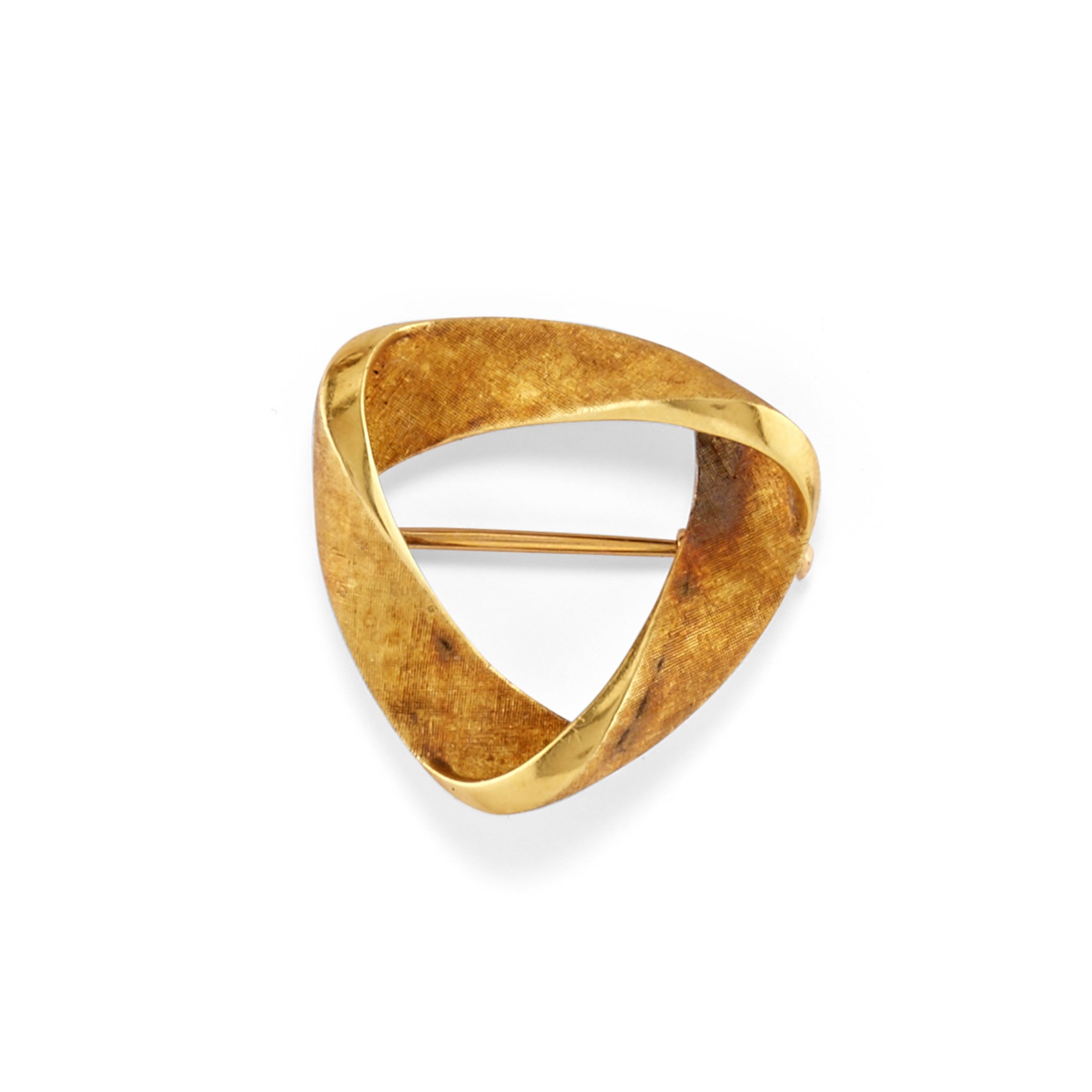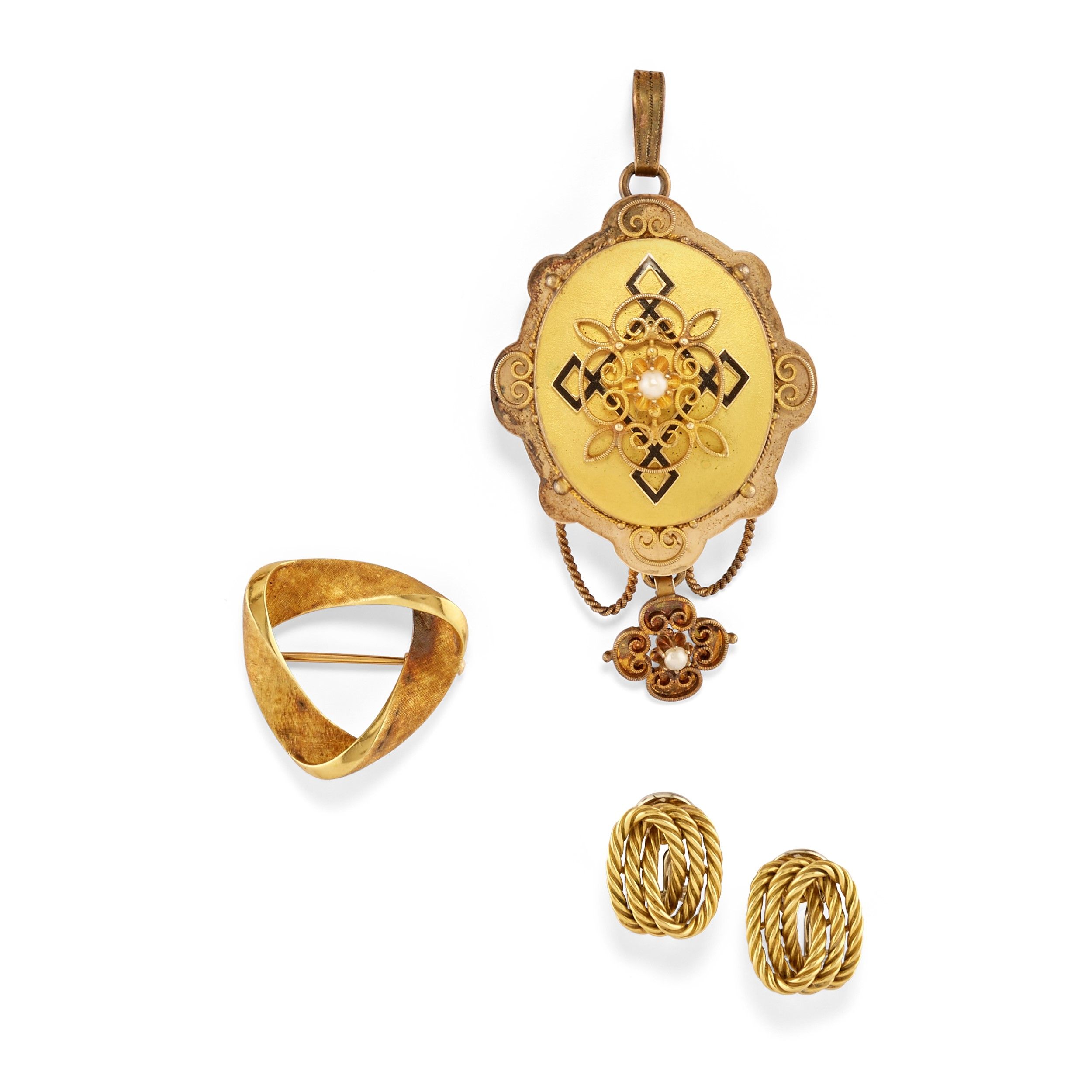 spilla-pendente con micro-perle e decoro in smalto nero, orecchini realizzati in filo d'oro ritorto con chiusura a clip, spilla triangolare in oro satinato.