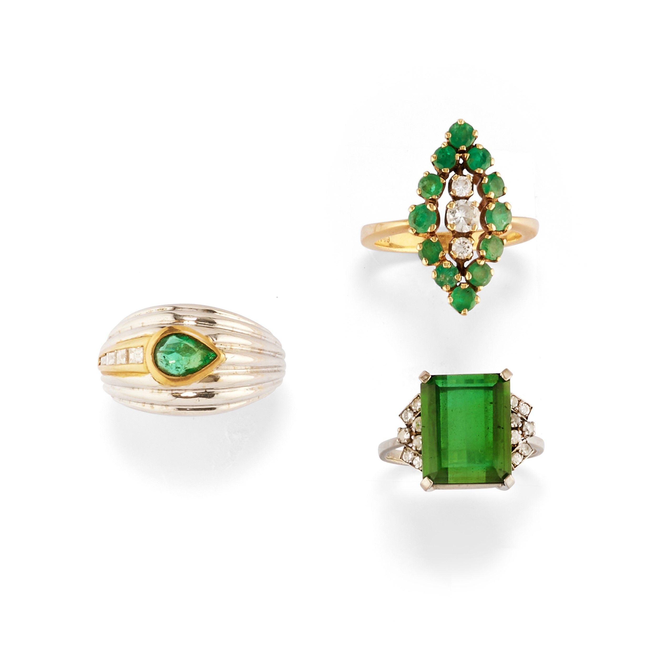 di varie forme e differenti decori, con smeraldi taglio rotondo e goccia, pietra verde (prob. tormalina) e diamanti taglio brillante, huit-huit e baguette.