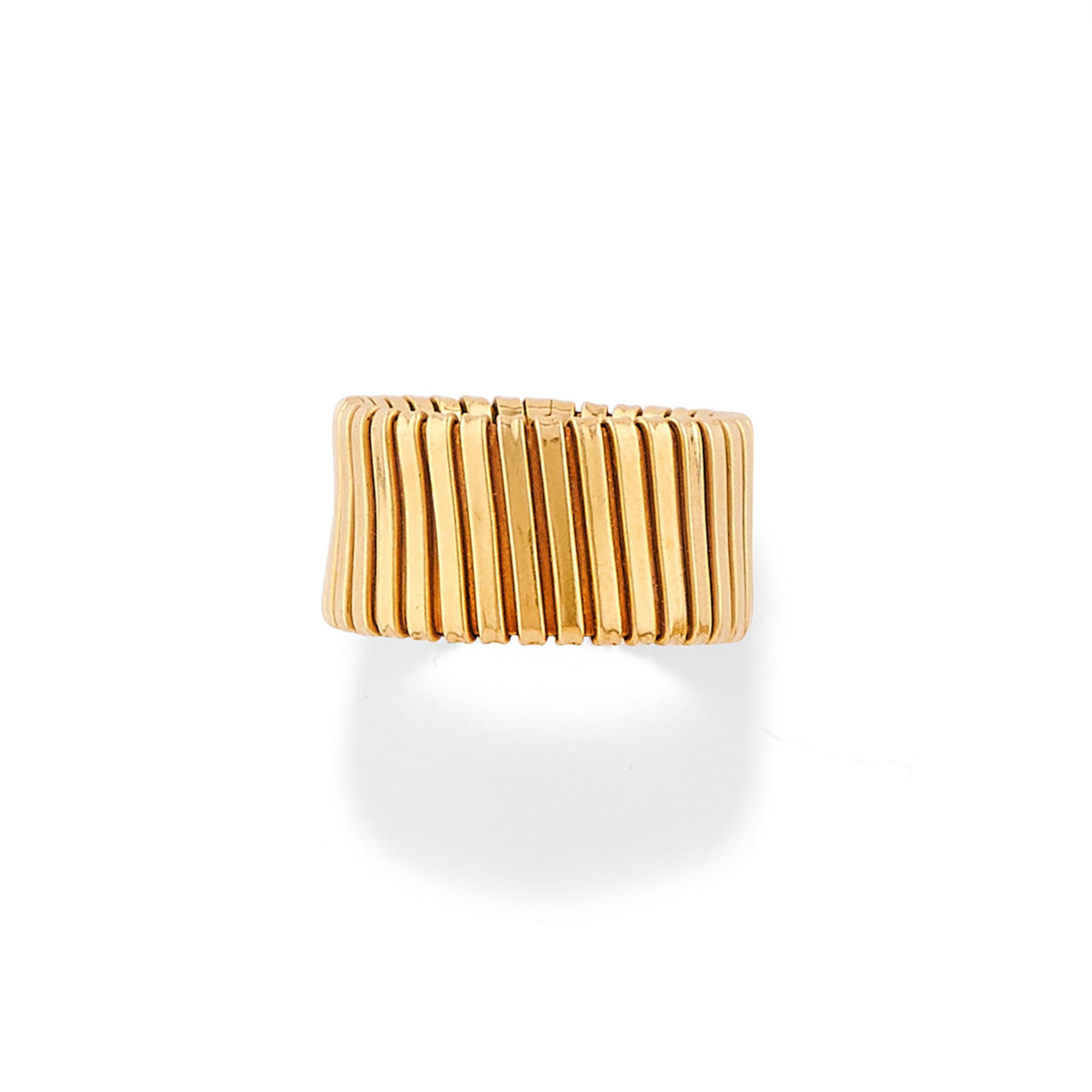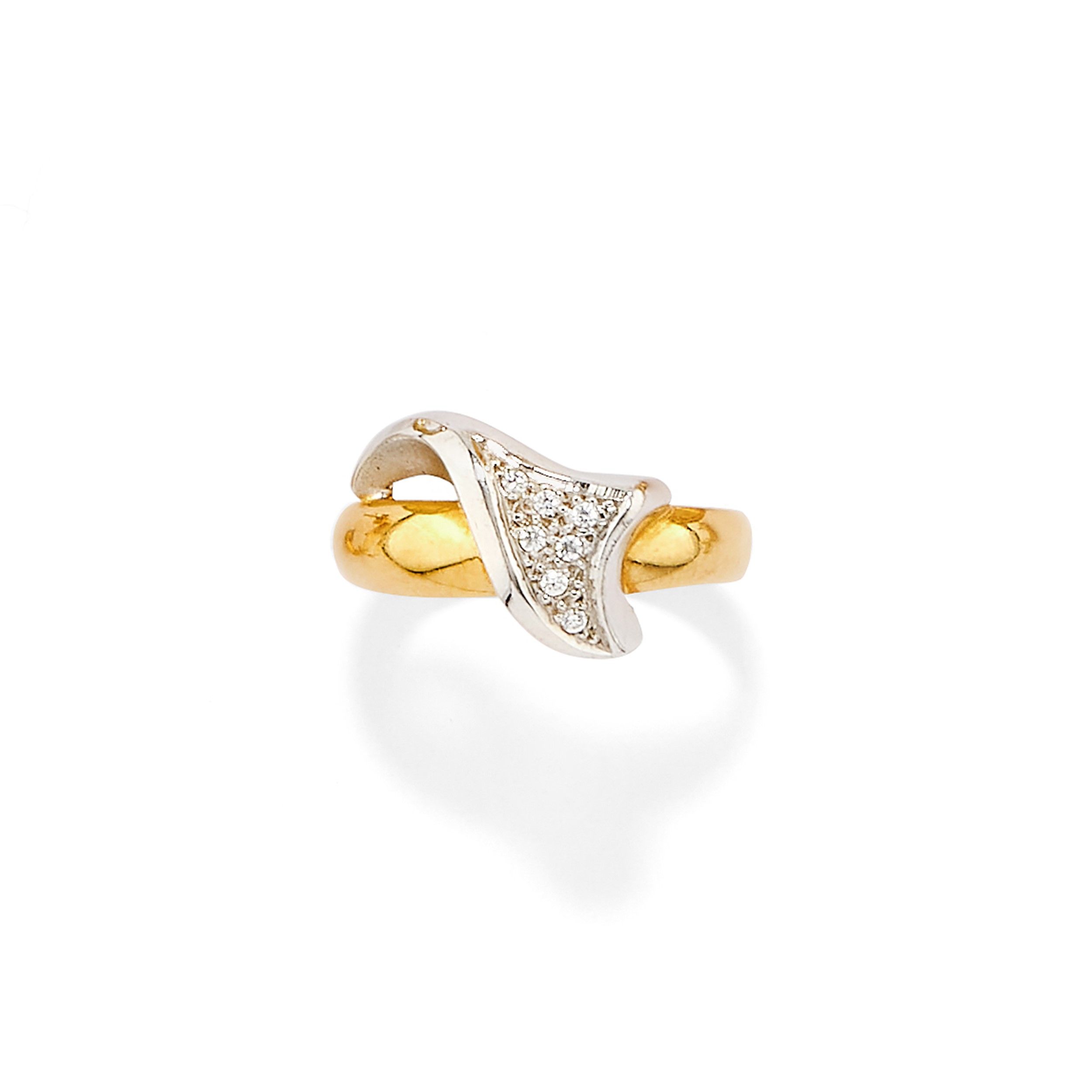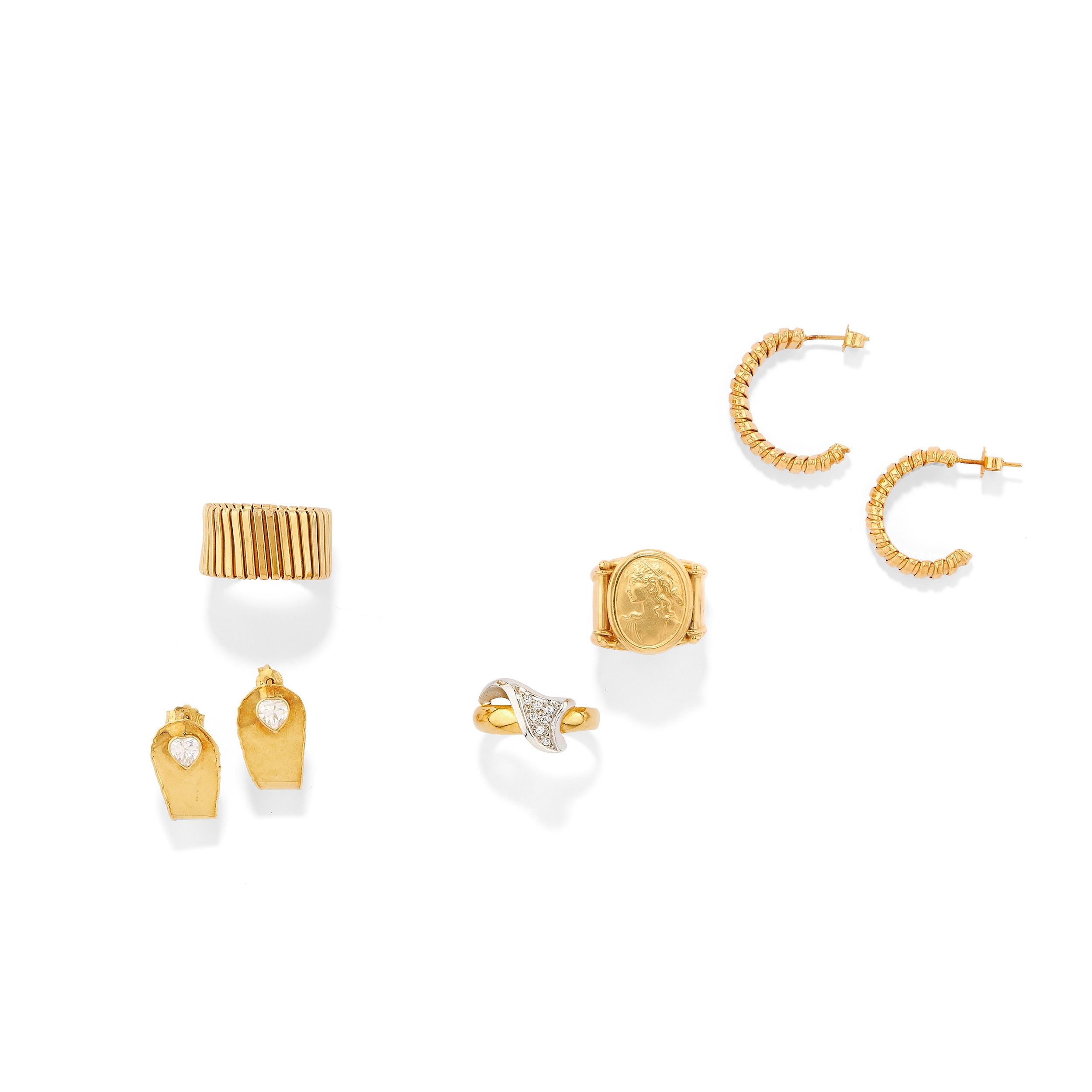 un anello tubogas, un anello con profilo femminile, un anello con piccoli diamanti taglio brillante, una coppia di orecchini a mezzo giro tubogas e una coppia di orecchini con pietre incolori ad imitazione del diamante, chiusura perno e farfalla.