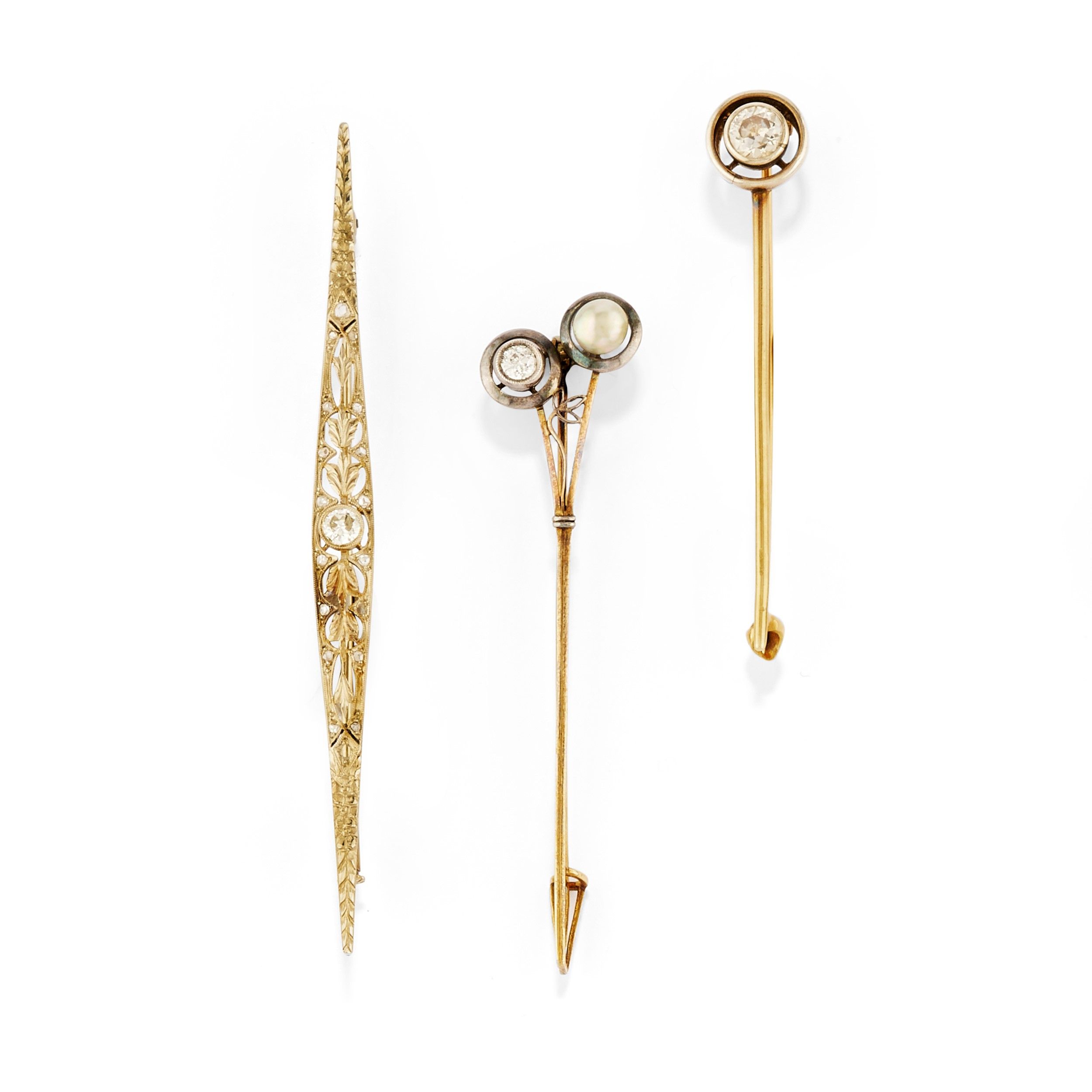 una traforata con decoro floreale al centro diamante taglio brillante di ct 0,20 circa e ai lati diamanti taglio rosa, una con diamante taglio vecchio di ct 0,20 circa e perla coltivata mabč, una con diamante taglio vecchio di ct 0,60 circa, difetti (un diamante taglio rosa mancante).