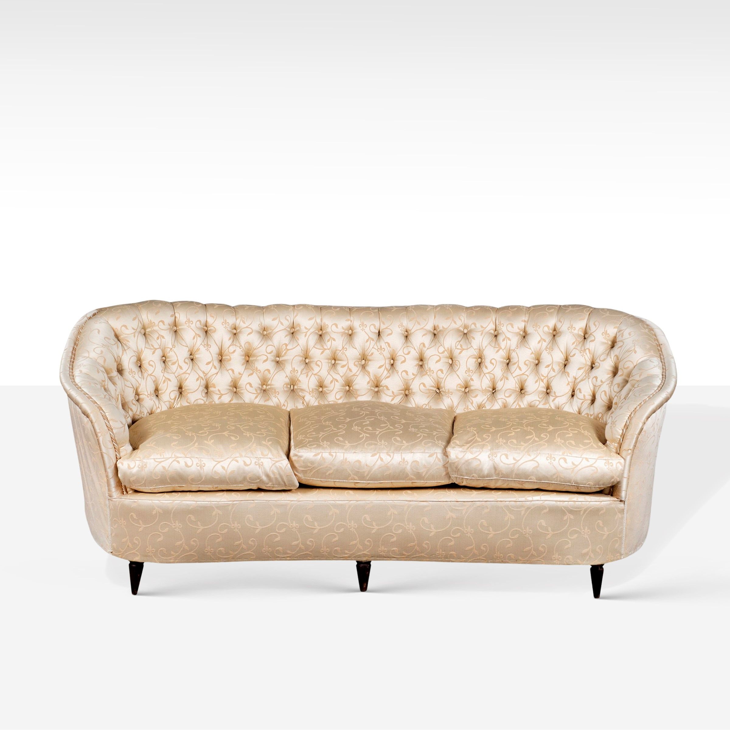 Italia, anni 30 divano tre posti in legno e tessuto imbottito. Perizia di autenticità Gio Ponti Archives, Milano.