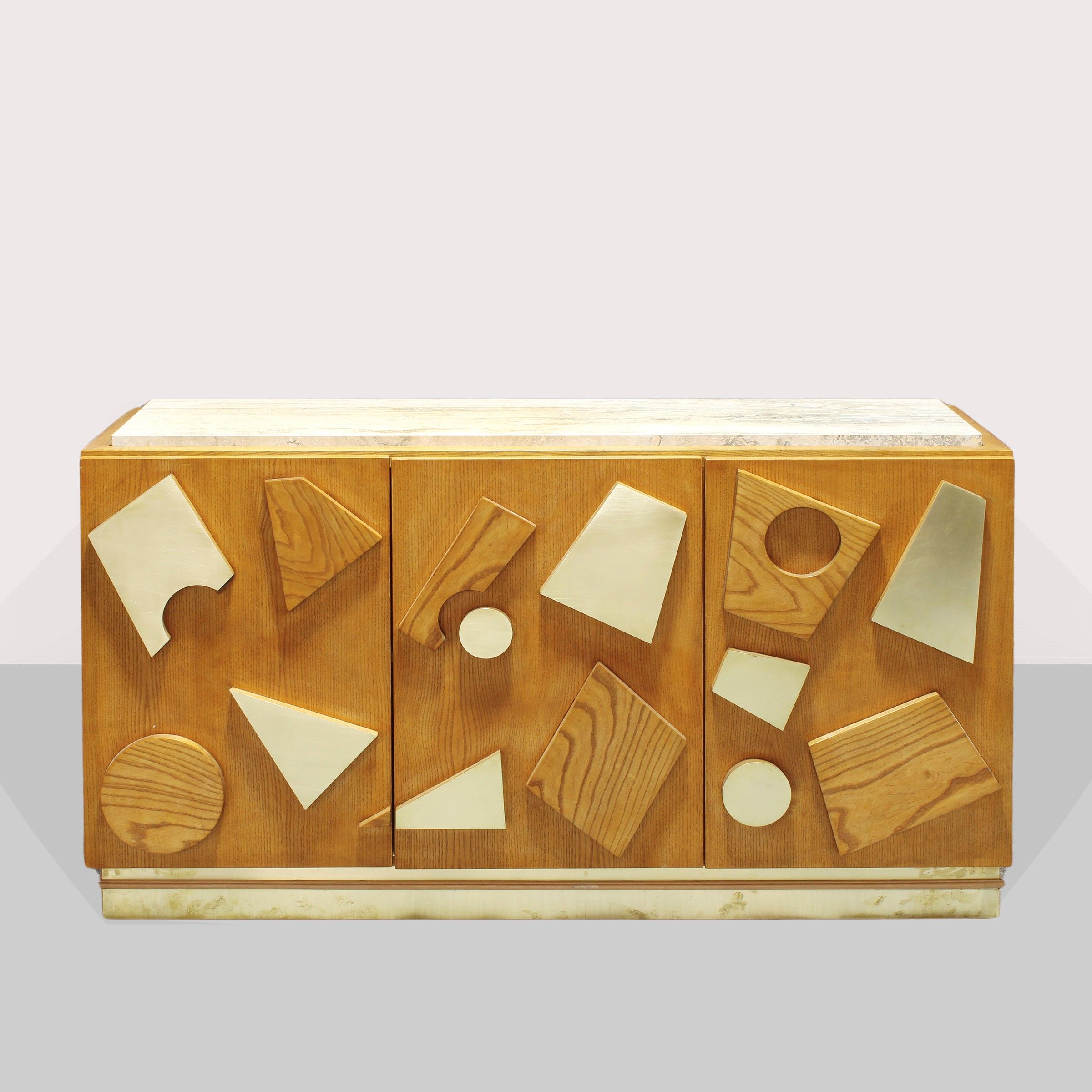 anni 90 cassettiera stile Brutalista in legno, ottone e marmo