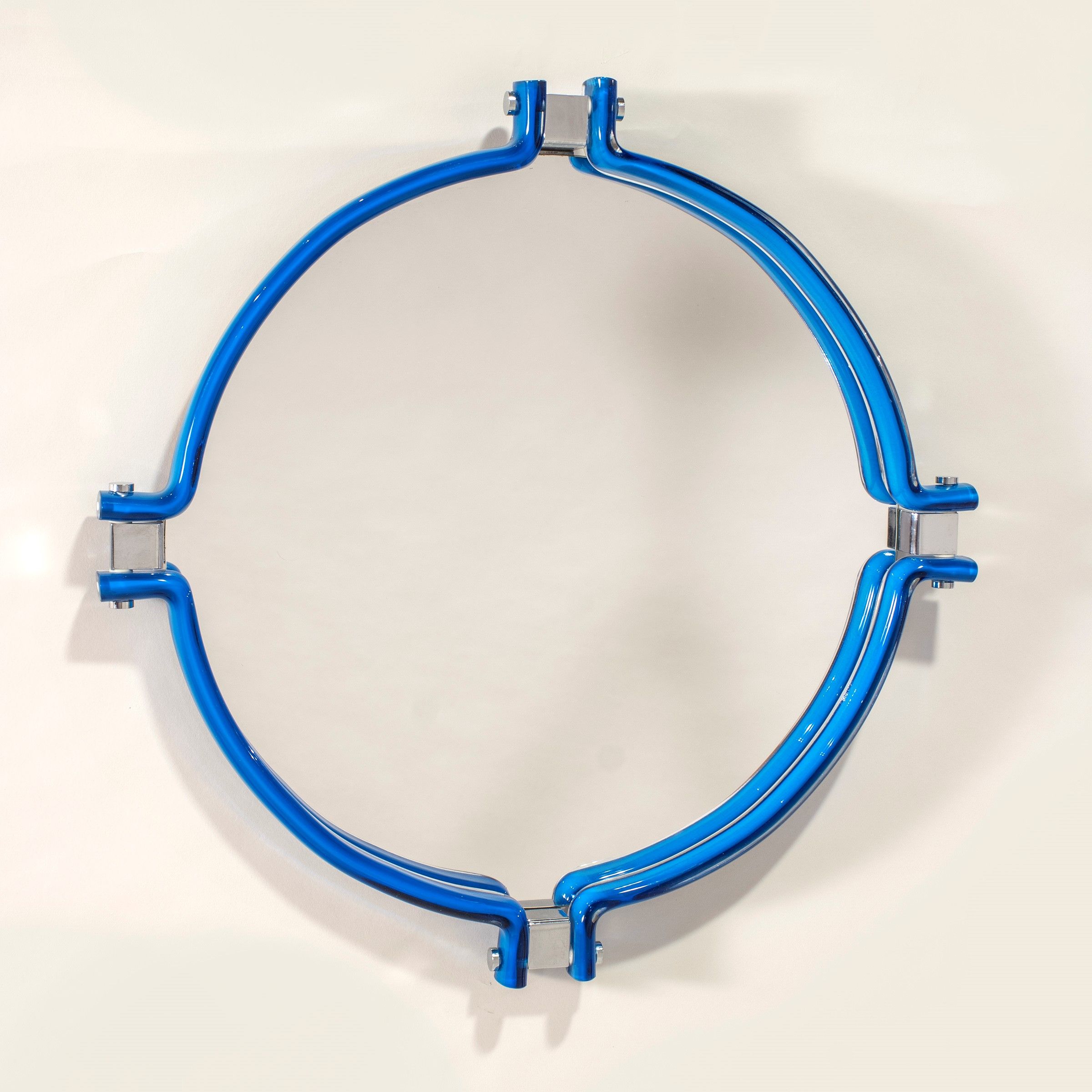 anni 70 specchio da parete in metallo cromato, vetro colorato e vetro specchiato
