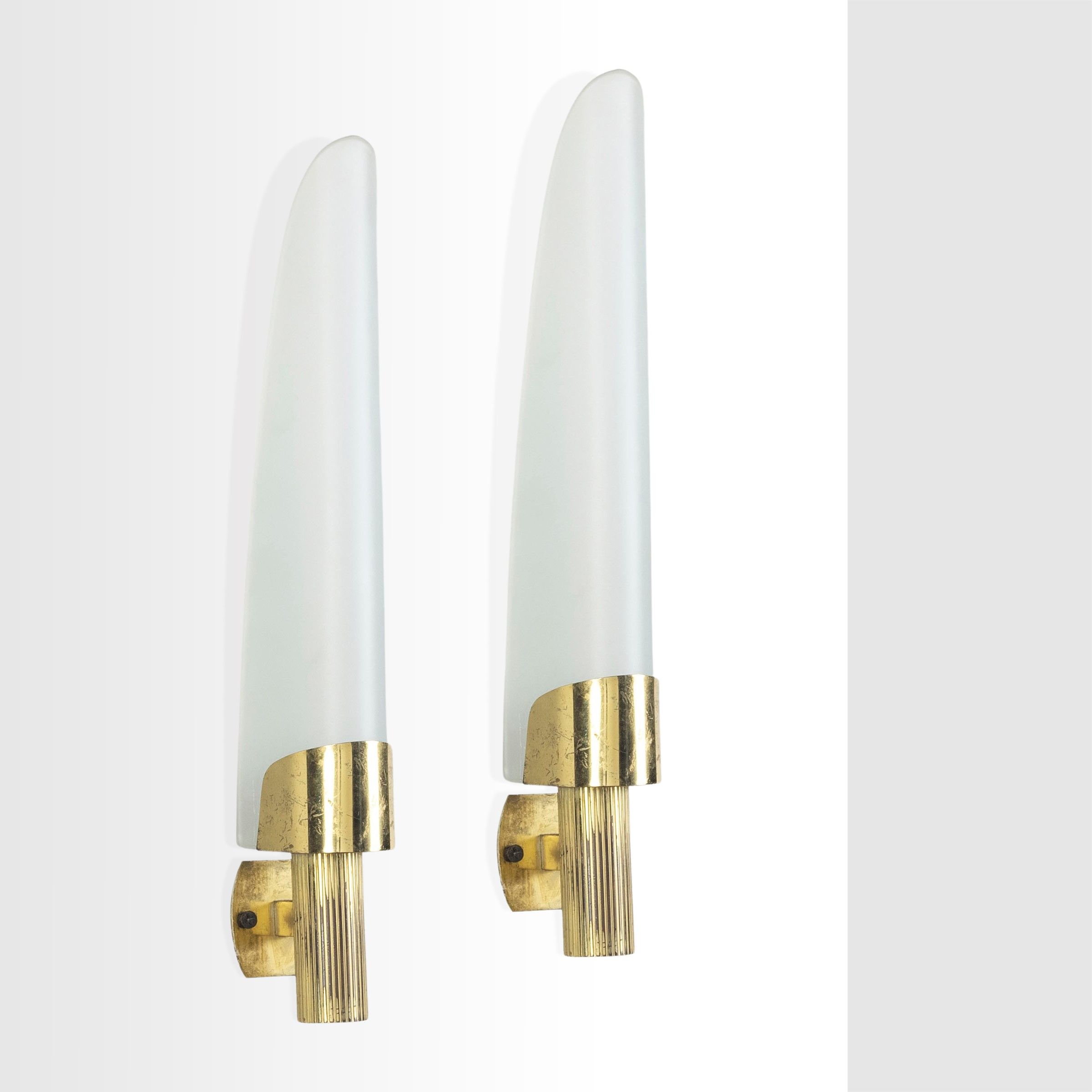 Italia, anni 60 coppia di lampade da parete in ottone e vetro satinato