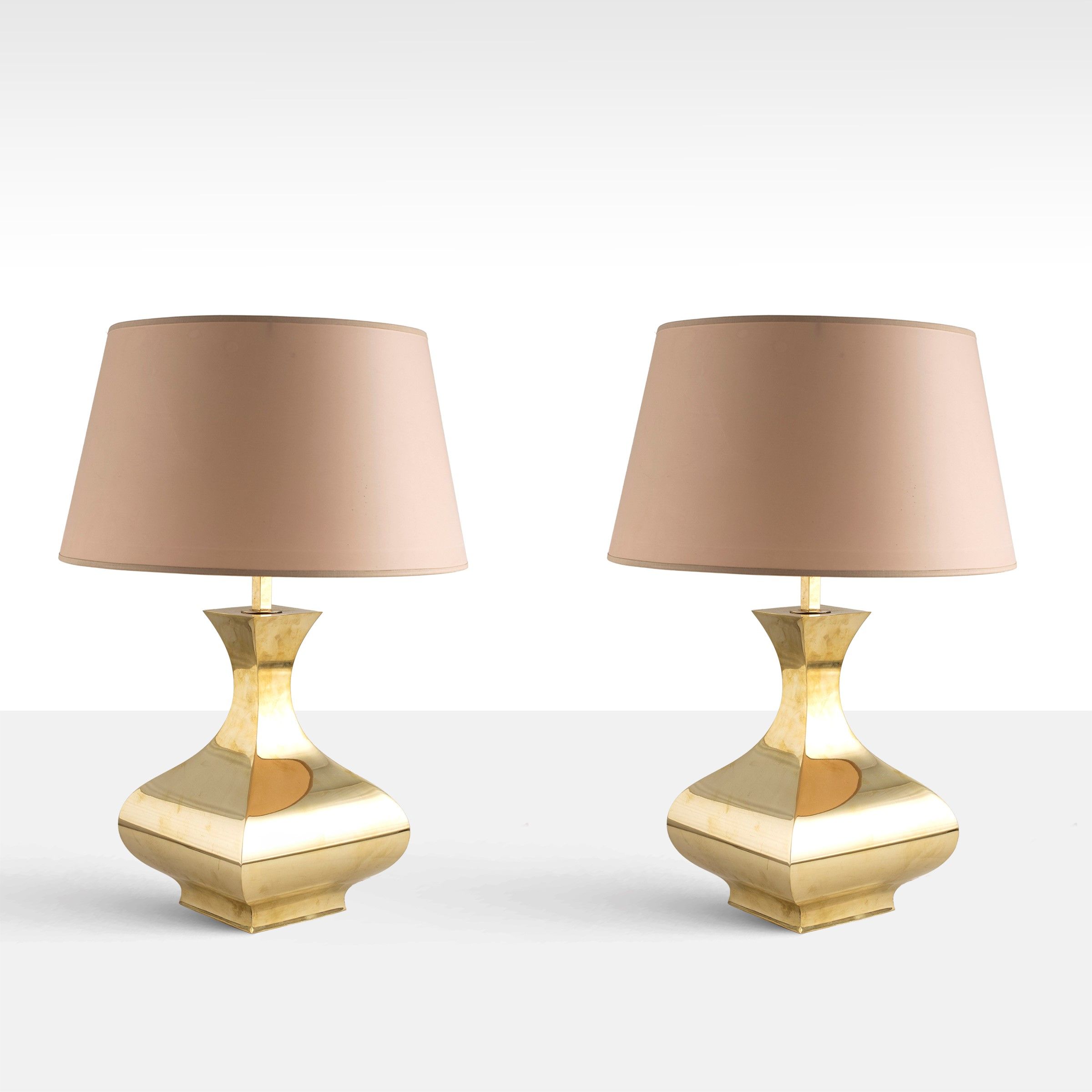 Italia, anni 70 coppia di lampade mod. Piramide in ottone, complete di paralume
