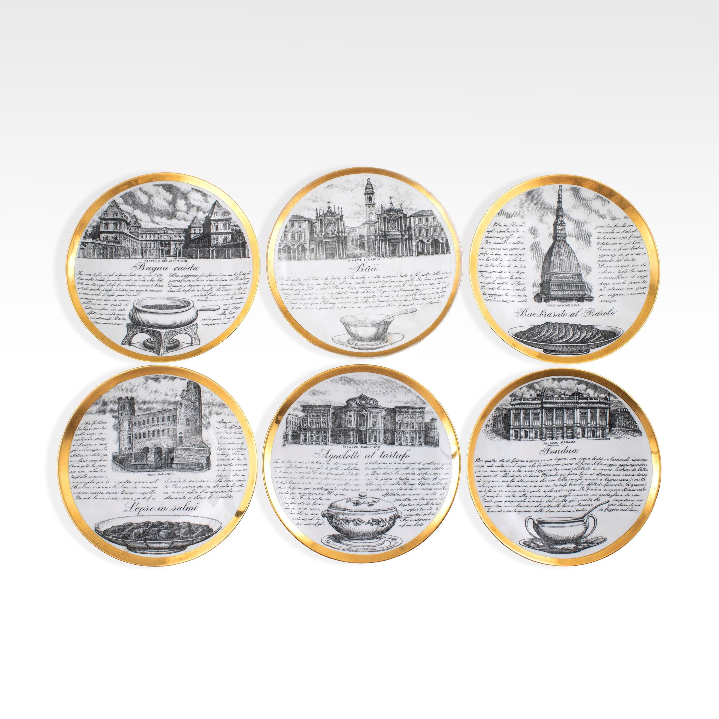 Italia, anni 60-70 sei piatti 'Specialità Torinesi', in porcellana, marchio della produzione, lievi usure