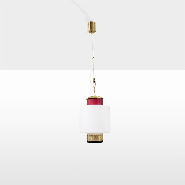 Italia, anni 50 lampada a sospensione mod. 8052 in ottone, acciaio, metallo verniciato e vetro satinato bianco e colorato, etichetta della produzione. Bibliografia: T. Bräuniger, Stilnovo, apparecchi per l'illuminazione, Éditions Luminaires, Modernistes, 2016