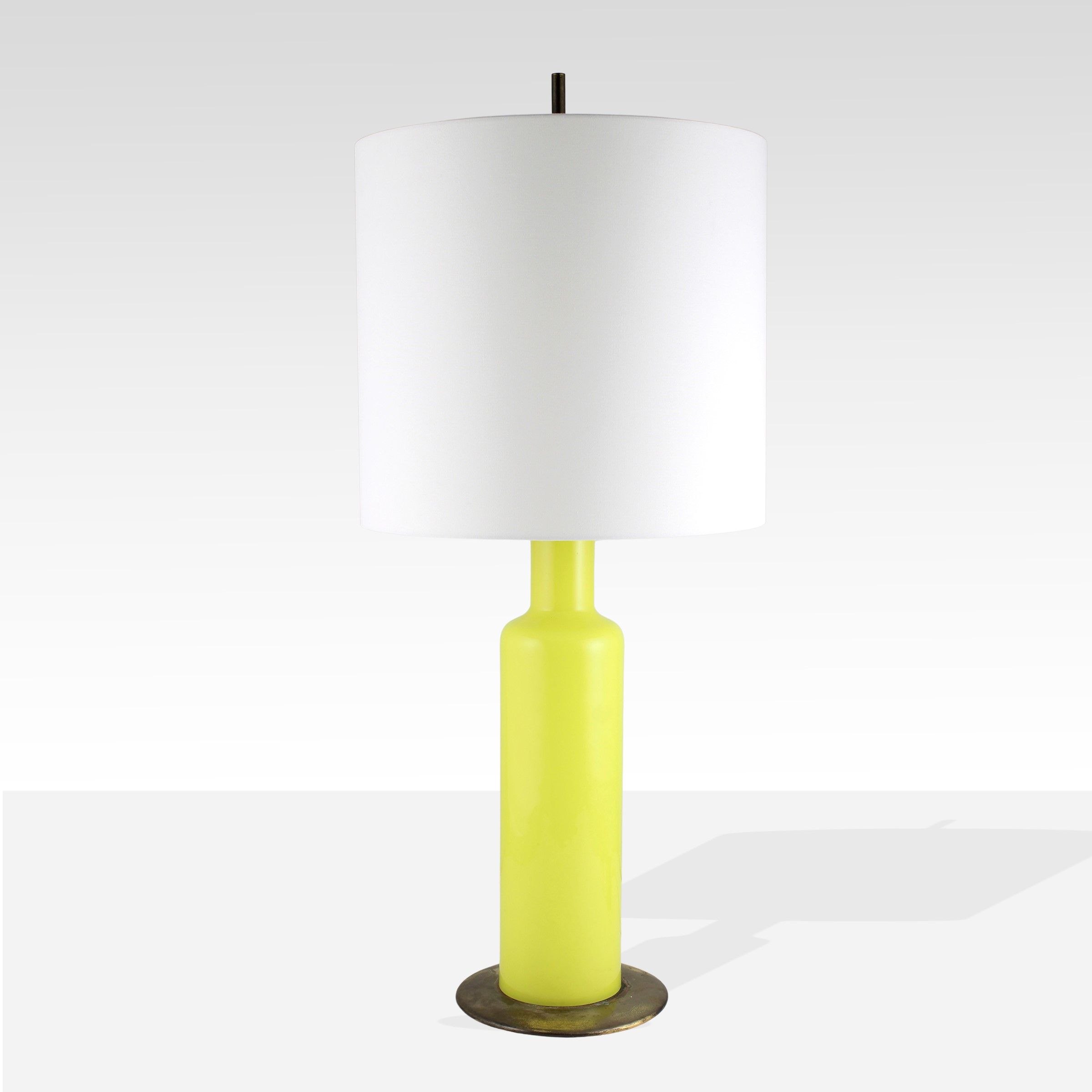 Italia, anni 60 lampada da tavolo in ottone e vetro opalino giallo, completa di paralume