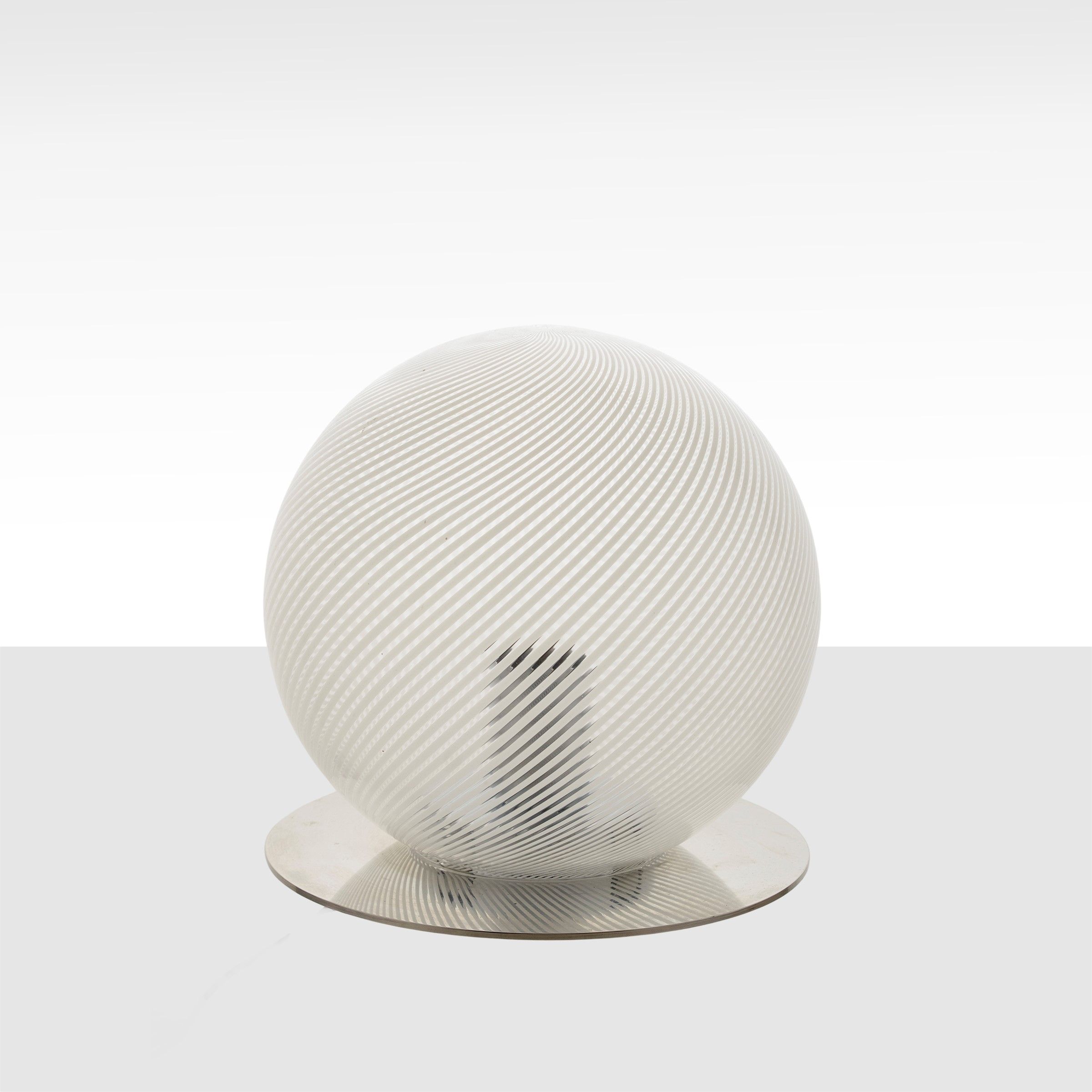 Murano, anni 70 lampada da tavolo in vetro soffiato trasparente a mezza filigrana lattimo e base in acciaio