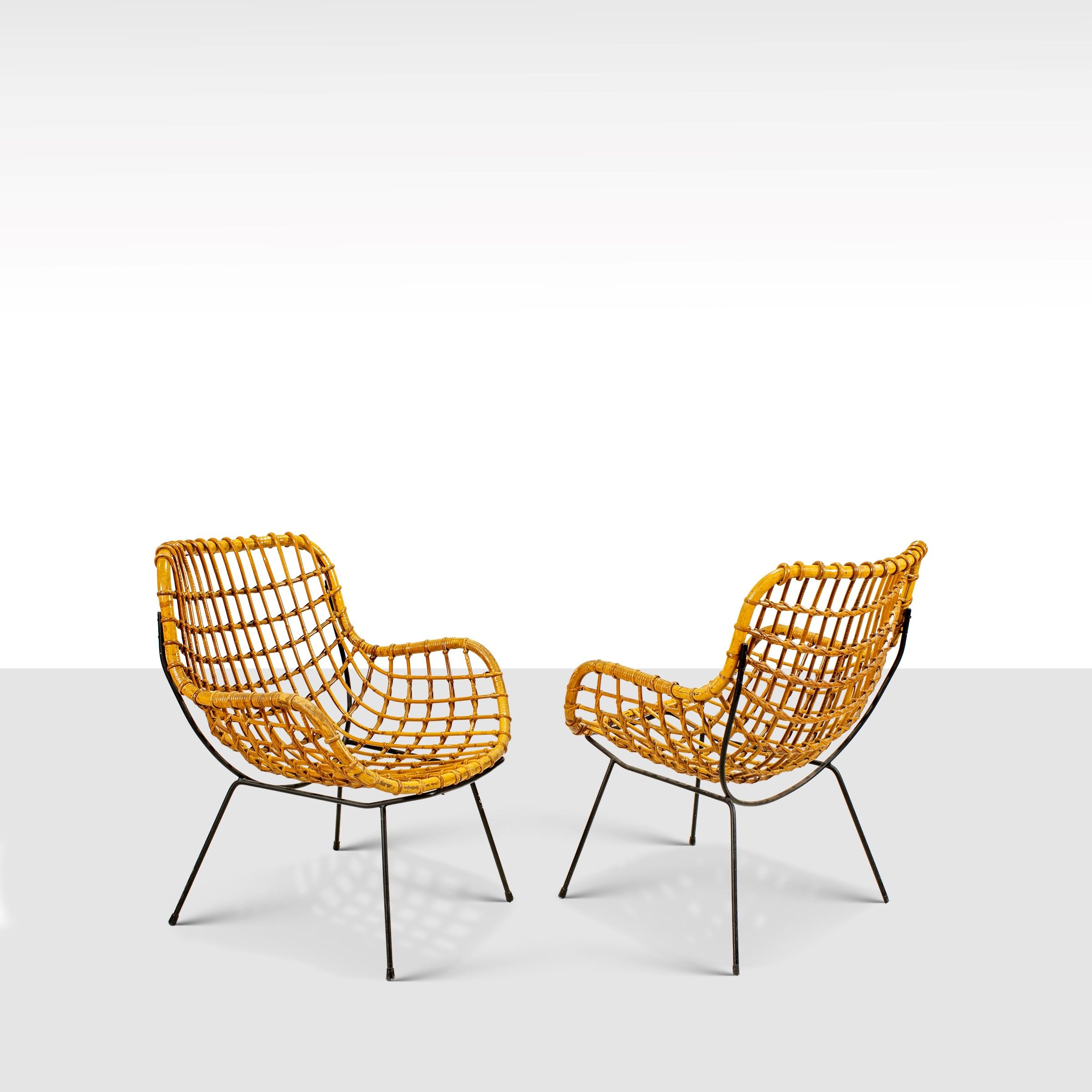 italia, anni 50 coppia di poltrone in midollino, bambù e metallo verniciato, lievi difetti