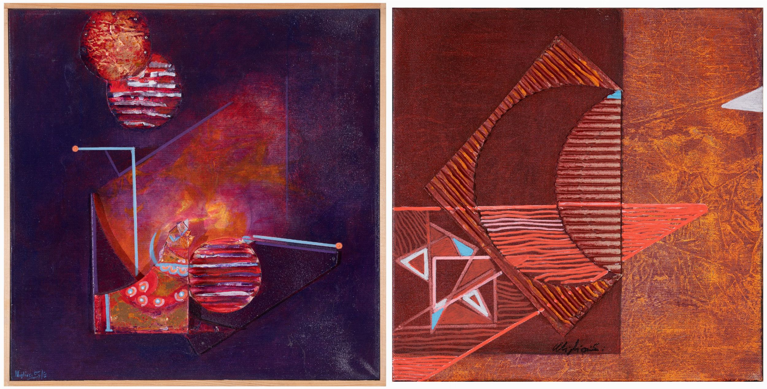 lotto di 2 tecniche miste con applicazioni su tela, cm. 30x30 cad.
