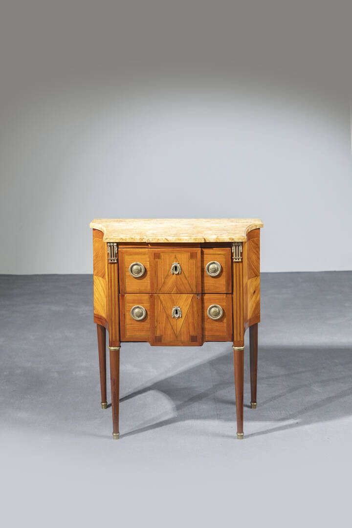85x107 Francia fine XIX secolo intarsiato in essenze pregiate. Due cassetti sul fronte.