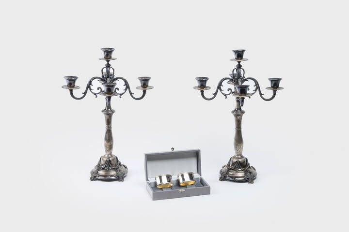 composto da: -Coppia di candelieri a cinque luci; poggianti su base circolare sorretta da piedini a volute e decorata con festoni. Fusto a colonna con decori a festoni. Peso gr 1453 e 1447 2 -Coppia di portatovaglioli. Peso gr 64 1. Entro scatola originale.