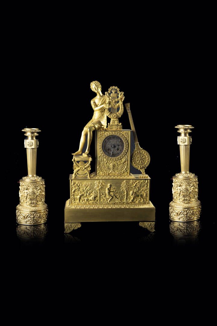 composto da pendola da tavolo e candelieri in bronzo dorato.