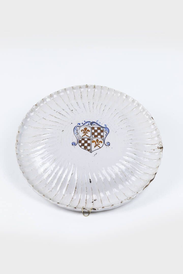 Diam. cm 45 5 in maiolica bianca parte centrale estroflessa bordo decorato con scanalature; al centro stemma nobiliare. Difetti diffuse abrasioni dell'invetriatura e rottura restaurata lungo il bordo.