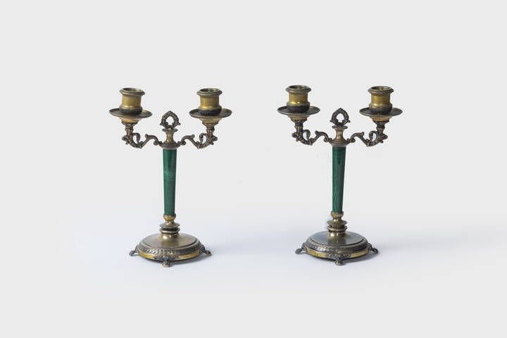 H cm 21 a due luci in ottone con corpo lastronato in malachite. Basi circolari con decori a palmette e poggianti su piedi ferini.