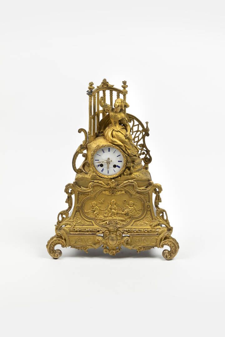 H cm 48 in bronzo dorato (difetti della doratura) XIX secolo. Parte superiore decorata con dama seduta su di un monte roccioso con quinta architettonica. Quadrante (difetti) in smalto con numeri romani marcato Cambieri Prano H./Casale. Parte inferiore con putti. Da revisionare non funzionante.