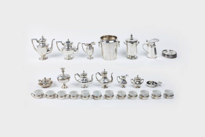 Peso complessivo gr 5341 ca composto da -12 porta tazzine (Peso gr 568) e 12 piattini (Peso gr 772) con elementi in ceramica. -1 secchiello portaghiaccio. Peso gr 906 -1 grolla dell'amicizia. Peso gr 520 -1 servizio composto da teiera caffettiera zuccheriera e lattiera corpi bombati e lavorati a torchon prese geometriche basi circolari. Peso gr 1249 -1 tastevin. Peso gr 107 - servizio composto da teiera caffettiera lattiera. Corpi bombati con basi circolari. Decori con motivi a palmette. Manici geometrici. Peso gr 1219 -1 versatoio termico. -1 candeliere con fioriera con base in legno. -1 secchiello portaghiaccio con interno non in argento.