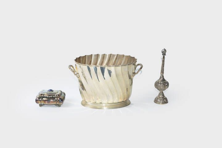 Peso gr 1722 1 composto da: -scatola di forma rettangolare bombata; con coperchio recante agata cabochon. Peso gr 267 0 -oggetto ornamentale di matrice orientale. Peso gr 185 1 -grande vaso in argento 925/1000 di forma ovale con corpo lavorato a torchon. Manici geometrici. Peso gr 1270.