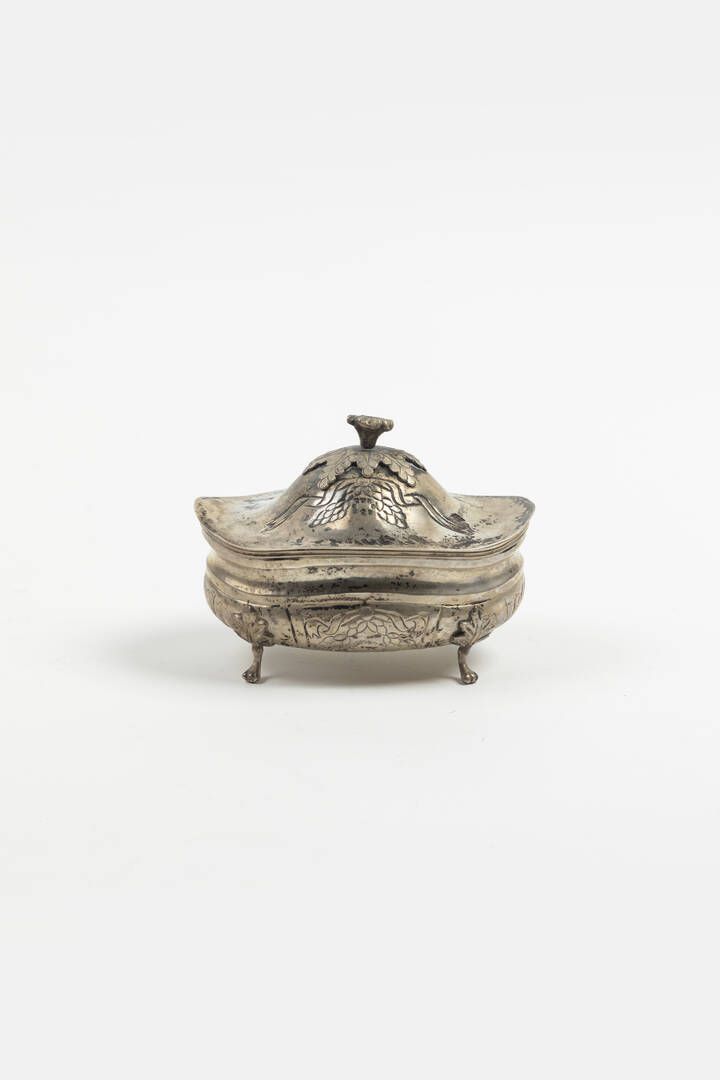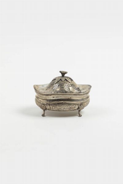Peso gr 243 6 Piemonte XVIII secolo non seca punzoni visibili. Presente sego di assaggio. Di forma mossa poggiante su quattro piedini leonini. Interamente cesellata a motivi vegetali.