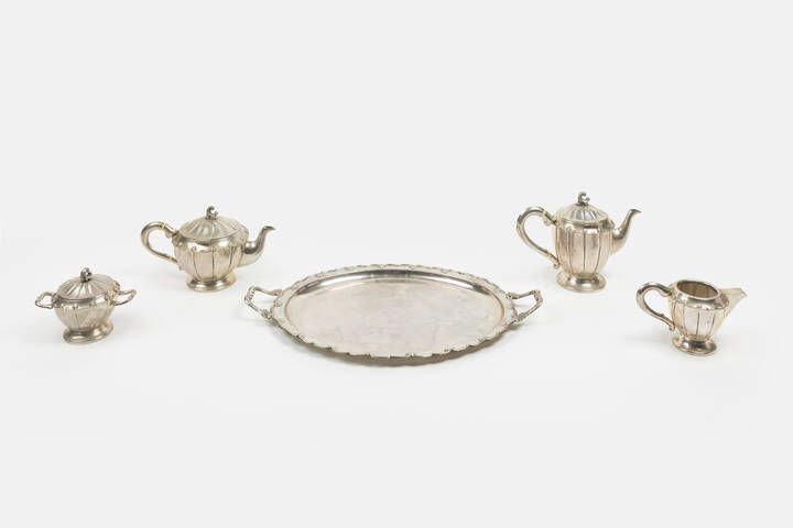 Peso gr 2798 6 composto da vassoio con manici a voluta; caffettiera zuccheriera teiera e lattiera. Corpi bombati e lavorati a bande; prese a ricciolo; manici in argento.