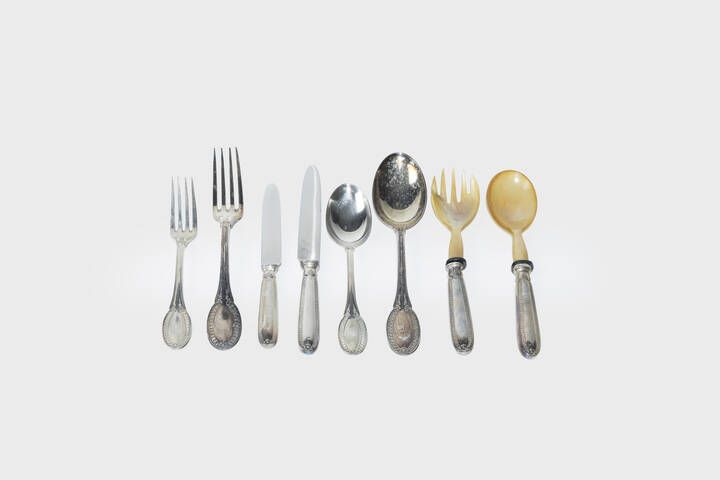 Peso gr 3347 9 composto da: -12 forchette grandi. Peso gr 843 2 12 forchette medie. Peso gr 523 9 - 12 coltelli medi. Peso gr 299 -12 cucchiai grandi. Peso gr 791 -12 coltelli grandi. Peso gr 421 6 -2 posate da portata. Peso gr 237 2 -2 posate da insalata. -1 mestolo. Peso 232