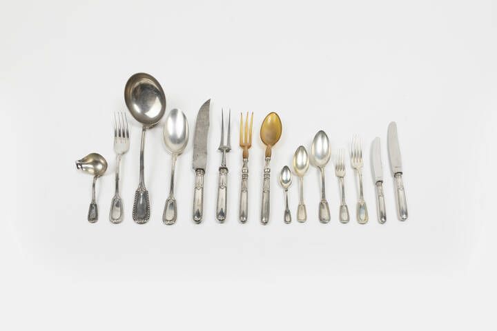 Peso gr 4812 6 circa -12 forchette medie decorate con sfere. Peso gr 629 6 -12 forchette grandi decorate con sfere. Peso gr 994 7 -12 cucchiai grandi decorati con sfere. Peso gr 964 8 -12 cucchiai medi decorati con sfere. Peso gr 621 9 -12 cucchiaini da dolce decorati con sfere. Peso gr 334 1 -4 pezzi da portata decorati con sfere. Peso gr 658 -2 posate da insalata decorati con sfere. Peso gr 47 -2 posate da arrosto (coltello e forchettone) decorati con sfere. Peso gr 65 5 -12 coltelli grandi decorati con sfere. Peso gr 296 -12 coltelli medi decorati con sfere. Peso gr 201