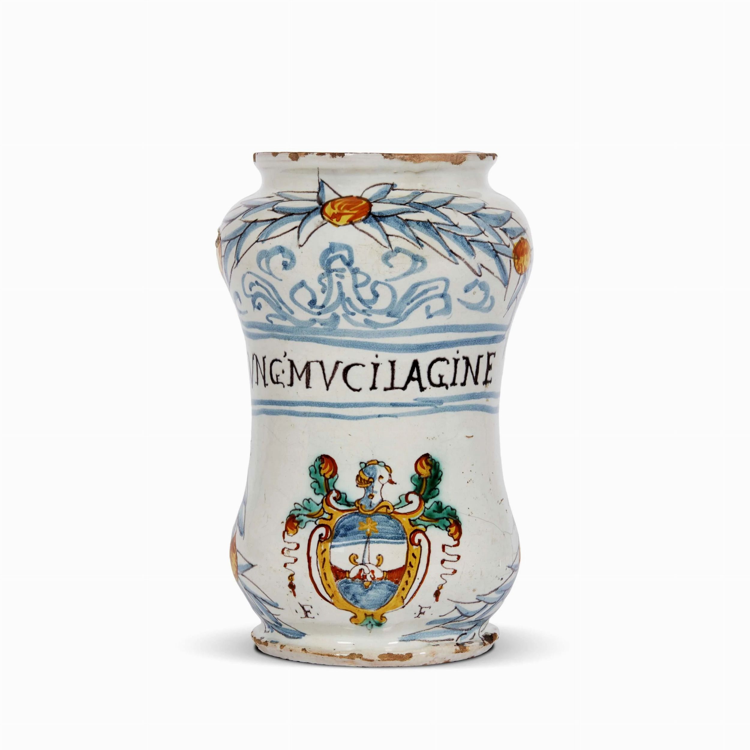 in maiolica dipinta in policromia, corpo cilindrico fortemente rastremato al centro, imboccatura con orlo estroflesso dal profilo sottile, collo breve su spalla rigonfia e piede basso dall’orlo tagliato a stecca e poggiante su una base piana. Il decoro interessa la parte frontale con una ghirlanda a festone fogliato a circondare il cartiglio rettangolare con scritta farmaceutica in lettere capitali, sotto al quale è dipinto un emblema con cimiero affiancato dalle lettere E ed F ; alt. cm 20,2, diam. bocca cm 9,8, diam. piede cm 9,8