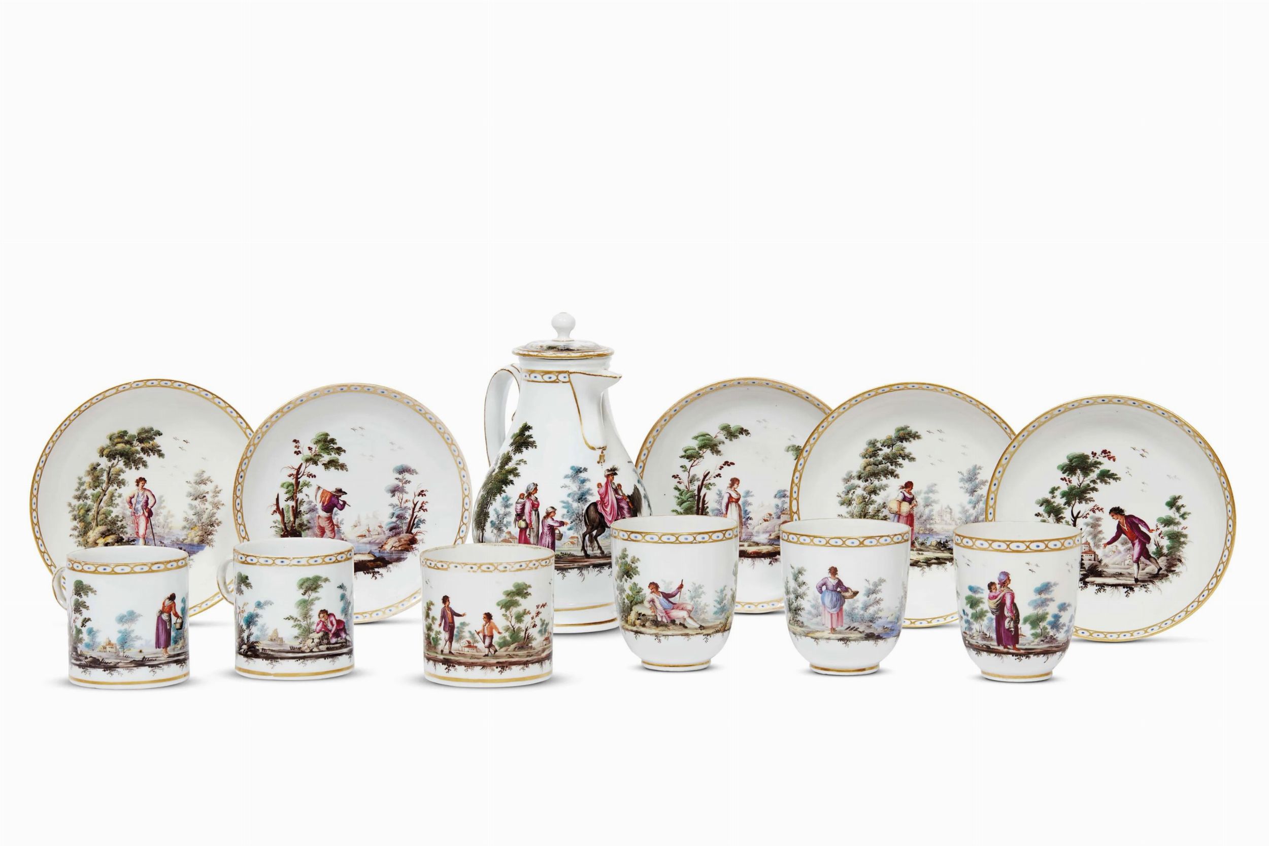 in porcellana dipinta in policromia e oro, composto da caffettiera, zuccheriera e cinque tazzine con piattino. La caffettiera ha corpo piriforme con coperchio piano e pomolo a sfera, la zuccheriera ha forma cilindrica, due tazzine a litron e tre tazzine campaniformi con ansa ad orecchio, tutte dotate di piattino circolare. Gli orli sono lisci e decorati con motivo detto “a uova tagliate”, mentre al centro delle composizioni su zolle aeree si stagliano in policromia alcuni personaggi raffigurati nei gesti quotidiani. La tipologia è definita in manifattura “a paesini” o “a paesini con figure”, ispirata da incisioni dai principali vedutisti dell’epoca, probabilmente sotto la direzione di Fanciullacci; caffettiera alt. cm 16,5, zuccheriera alt. cm 6,1, tazzine ovoidali alt. cm 7, tazzine cilindriche alt. cm 6,2, piattini diam. cm 12,6 (3) e cm 13 (2)