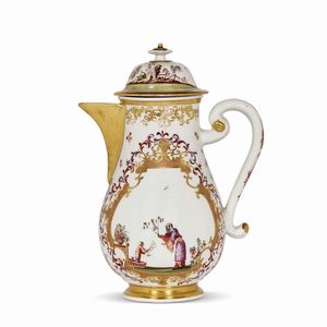 CAFFETTIERA, MEISSEN, 1725-1730 in porcellana dipinta in policromia e oro, corpo piriforme su piede modanato, [..]