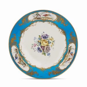 PIATTO, SÈVRES, 1760 CIRCA in porcellana con tesa blu celeste, al centro un bouquet sciolto, circondato [..]