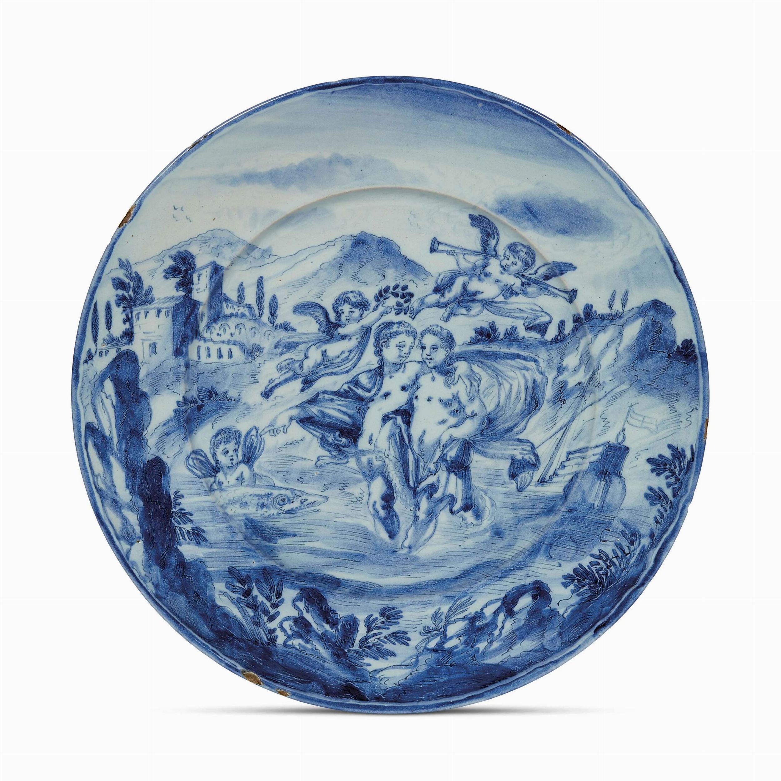 in maiolica dipinta in monocromia blu, tesa orizzontale e ampio cavetto decorato sul recto da una scena figurata con sfondo paesaggistico con architetture turrite, montagne e quinte rocciose a fare da sfondo ad una scena istoriata: sullo sfondo, una nave semiaffondata, due giovani abbracciati si allontanano sulle acque accompagnati dal volo di amorini in trionfo, mentre il giovane si trasforma in tritone. Al verso decoro con piantine alla cinese e al centro la marca scudo in azzurro, tradizionalmente attribuita alle fornaci di Savona; diam. cm 35,8, alt. cm 5,2