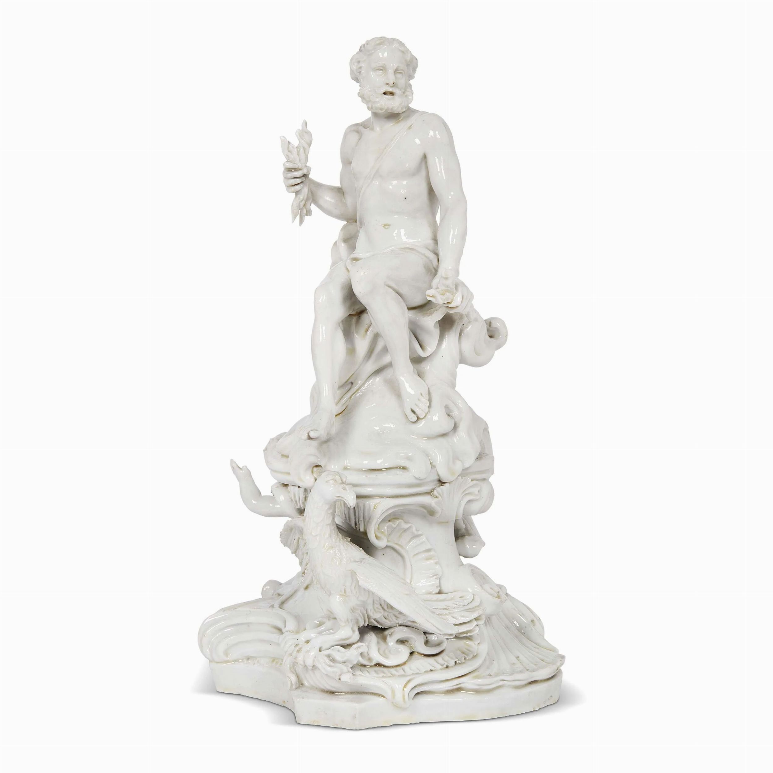 in porcellana bianca, raffigurante Zeus seduto su una nube che emerge da una base roccocò, con un fulmine nella mano destra pronto a scatenare una tempesta, mentre tra i nembi appare Eolo, già pronto a soffiare il vento, e un putto seduto con le manine alzate assiste alla scena. Il modellato e la materia sono quelli delle miglior produzione della manifattura veneziana, con confronti molto prossimi; cm 21,5x12,5x12