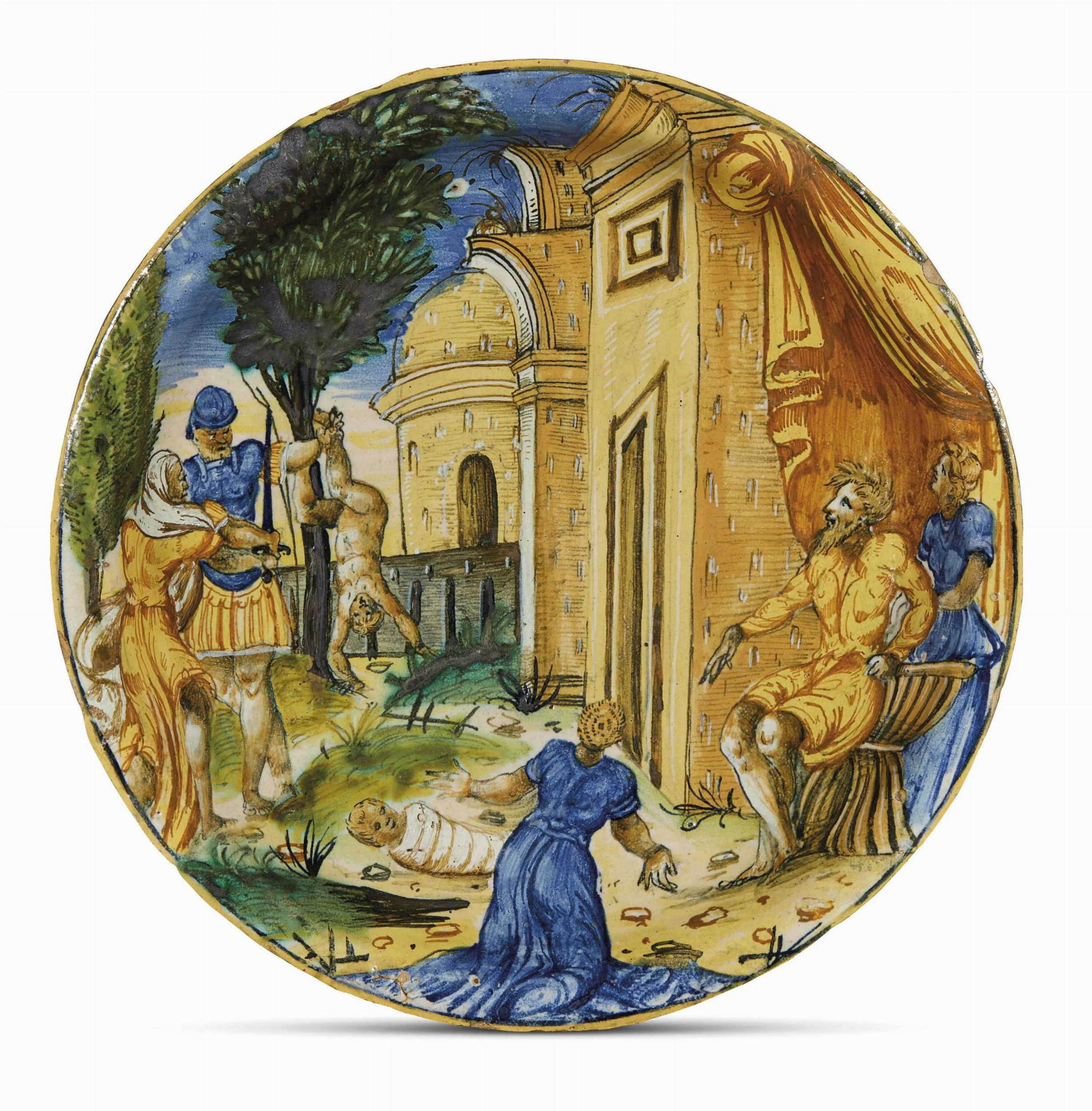 in maiolica dipinta in policromia raffigurante il Giudizio di Salomone, come descritto dalla legenda iscritta sul retro: Sentenzia de Sallamone / 1545 . La forma della coppa, ampia con tesa rialzata e bordo estroflesso, la qualità dello smalto, spesso e granuloso, e soprattutto lo stile pittorico, con figure slanciate con le mani grosse e i volti sottili, ci suggeriscono una probabile produzione di questo esemplare all’interno del ducato di Urbino; diam. cm 25,4, diam. piede cm 13,3, alt. cm 4