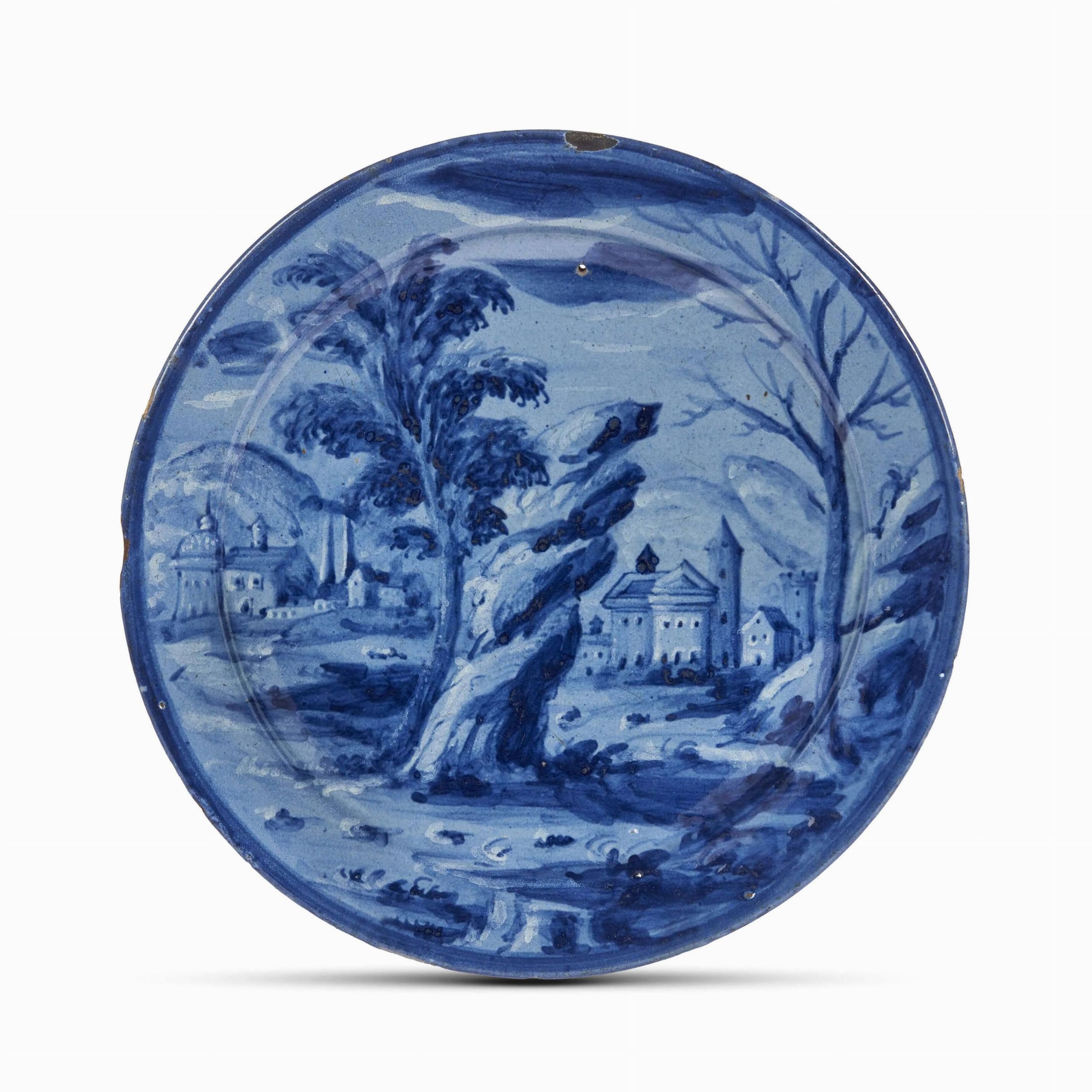 in maiolica dipinta in monocromia azzurra, cavetto profondo e larga tesa piana con bordo leggermente rilevato. Il decoro, che si sviluppa uniformemente su tutto il fronte, mostra un paesaggio con due gruppi di edifici intervallati al centro da una roccia verticale affiancata da un albero sinuoso. Sul retro l’anello del piede è circondato dal tipico decoro a canestro. Sul fondo vecchia etichetta di collezione; diam. cm 25,2, diam. piede cm 11,6, alt. cm 3,2