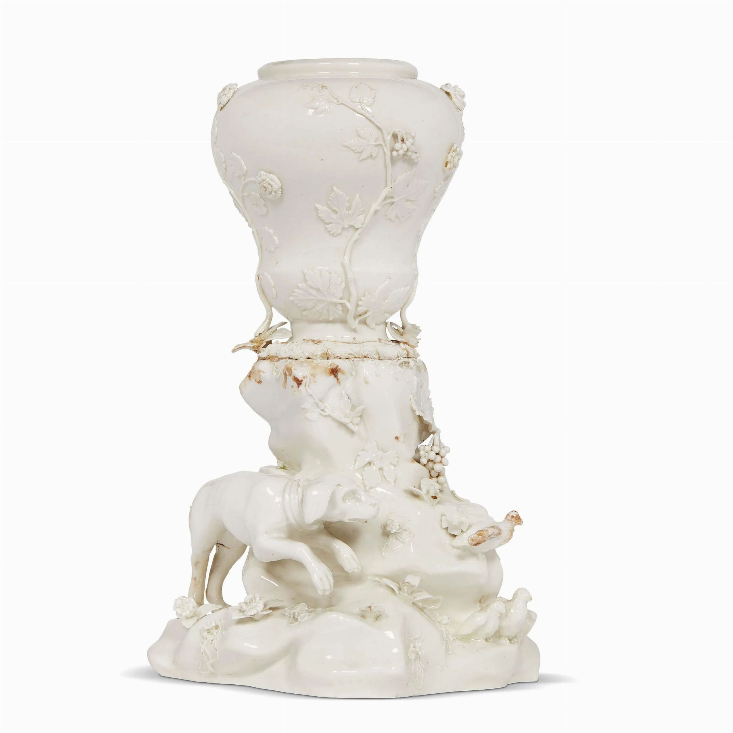 in porcellana bianca, corpo sagomato a base rocciosa con un cane, colombe e pampini e grappoli di uva, sormontata da un contenitore piriforme con imboccatura circolare, decorato da elementi fitoformi a rilievo. Il vasetto portaprofumo, ispirato a esemplari francesi in argento, trova preciso riscontro in due esemplari analoghi conservati nel Museo della Certosa di San Martino (Inv. n. 575(1), recentemente riconosciuti come facenti parte della produzione di Capodimonte attorno agli anni 1743-1744 con analogie negli animali del Gricci. Marca giglio in blu sul fondo; cm 21x11,5x11