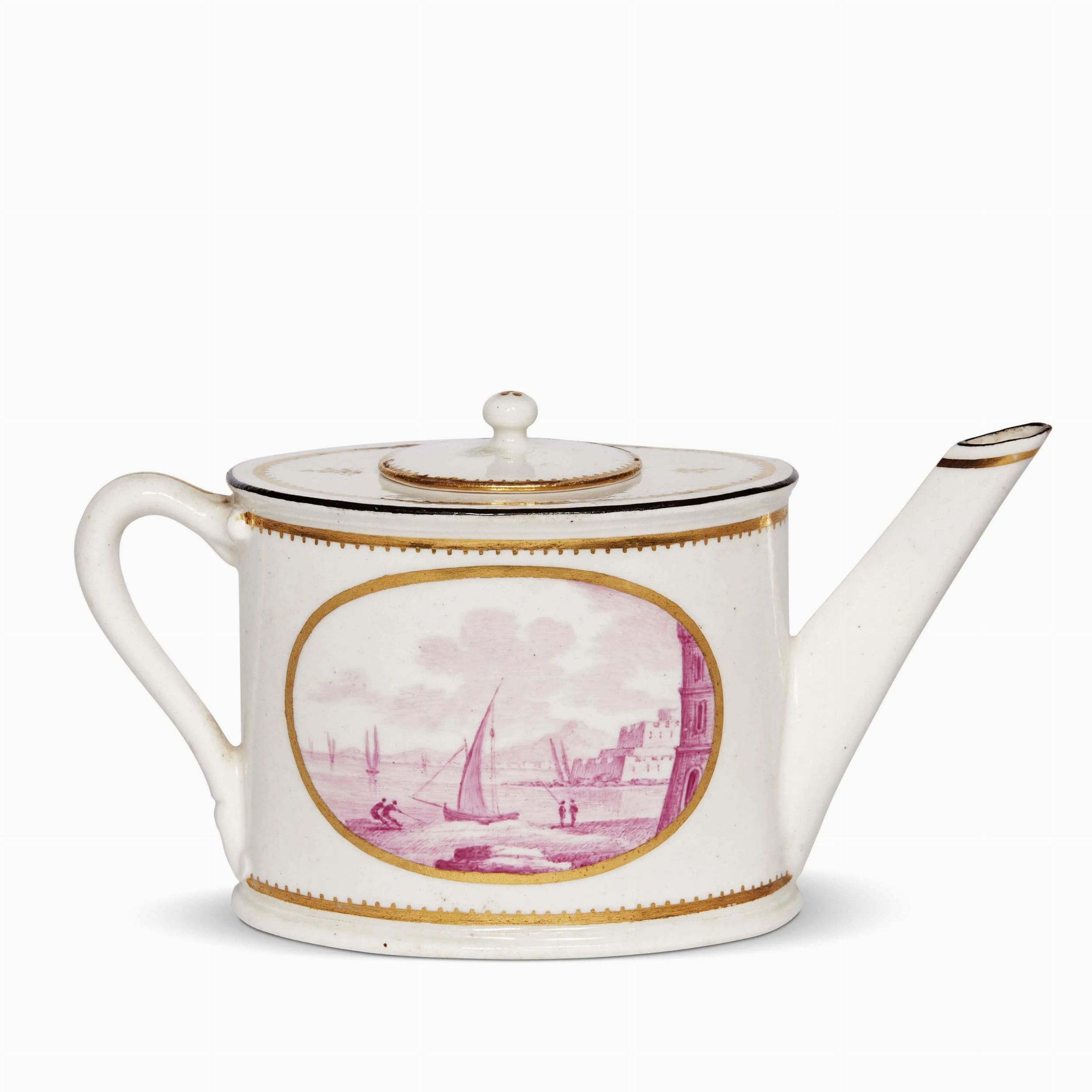 in porcellanala dipinta in monocromia porpora e oro, corpo di forma ovale con ansa sagomata, piccolo coperchio piano e alto beccuccio cilindrico, modello documentato nella produzione tra il 1795 e il 1800 durante il periodo Venuti. Il decoro, limitato a due medaglioni ovali al centro delle due facce, riproduce in color porpora delle vedute paesaggistiche marine, contornate da filettature di oro ad arricchire l’ornato. Sul fondo etichetta di provenienza S. Giusti / U. Podestà – Milano ; cm 9x16,4x7