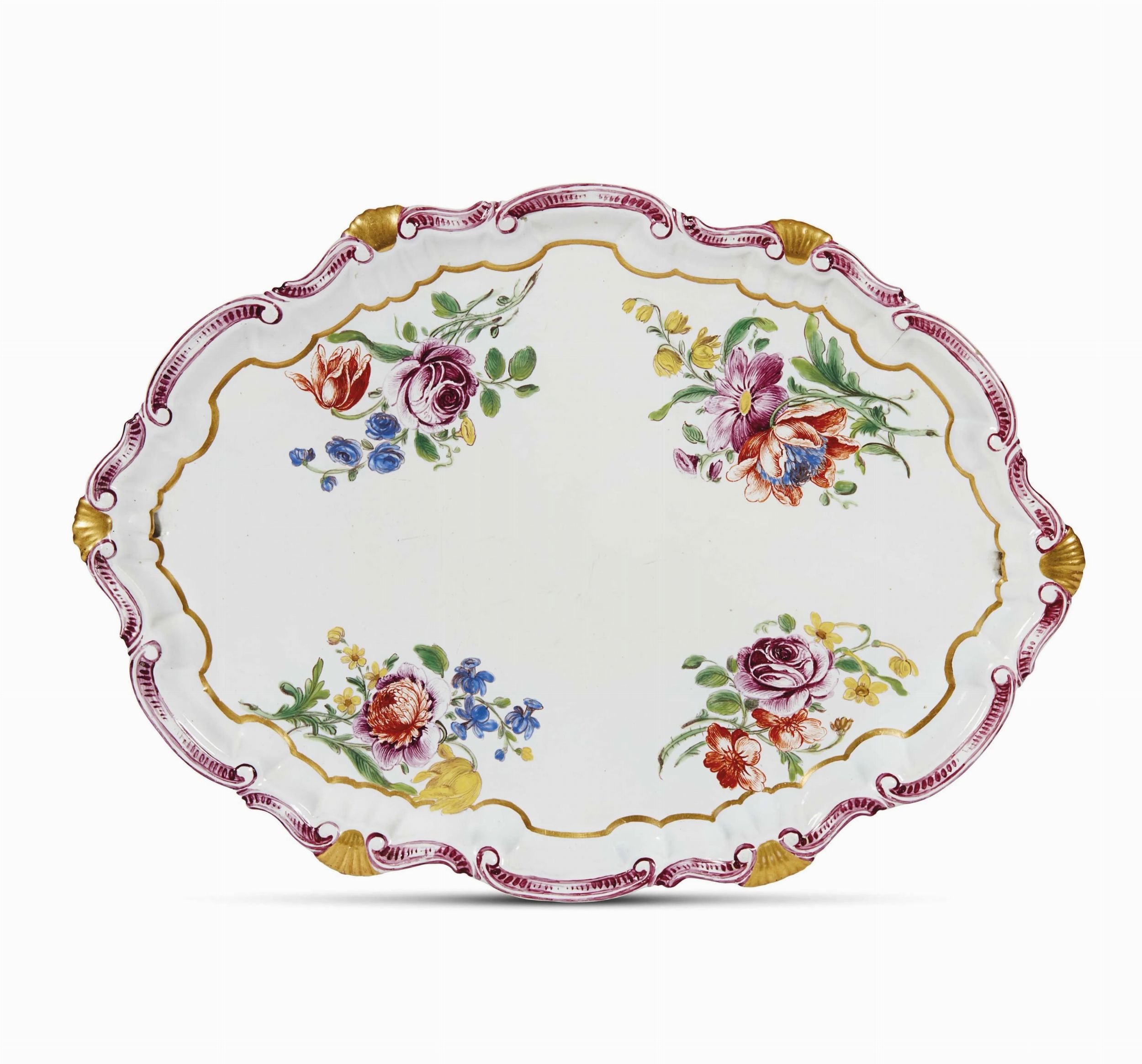in porcellana dipinta in policromia e oro, di forma particolarmente elegante e orlo mistilineo con decori a rilievo, mostra un decoro con quattro mazzetti di fiori disposti simmetricamente nella fascia esterna. La forma e la disposizione dei decori, mancanti al centro, ci portano a pensare che questo vassoietto fosse destinato a sostenere un dejeunè , sul modello del piatto montato pubblicato da Leonardo Ginori Lisci; cm 19,6x27,6, alt. cm 1,6
