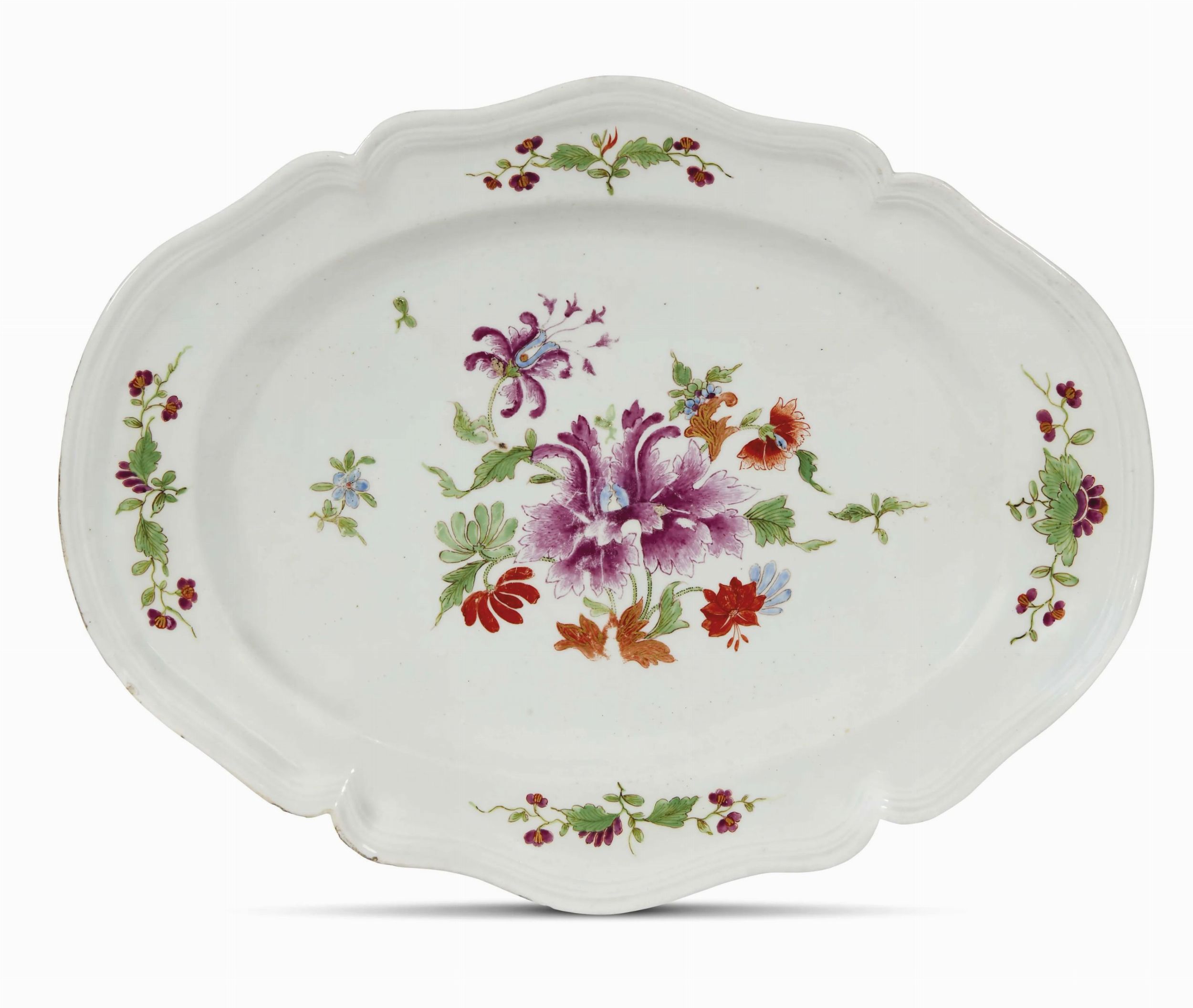 in porcellana dipinta in policromia, di forma quadrilobata con tesa mossa sagomata e orlo centinato, cavetto profondo. Il decoro, che vede protagonista il classico tulipano di origine cinese, è qui declinato in una formula coloristica con prevalenza del color porpora sfumato non contornato, unito a un bouquet molto variegato che si ripete in minori dimensioni nei gruppi floreali disposti sulla tesa, forse seguendo i dettami di quel decoro descritto in manifattura “con fiori colore di porpora, o rosso nel mezzo e con fiorellini all’intorno e qualche doratura”; cm 26,2x34, alt. cm 3,5