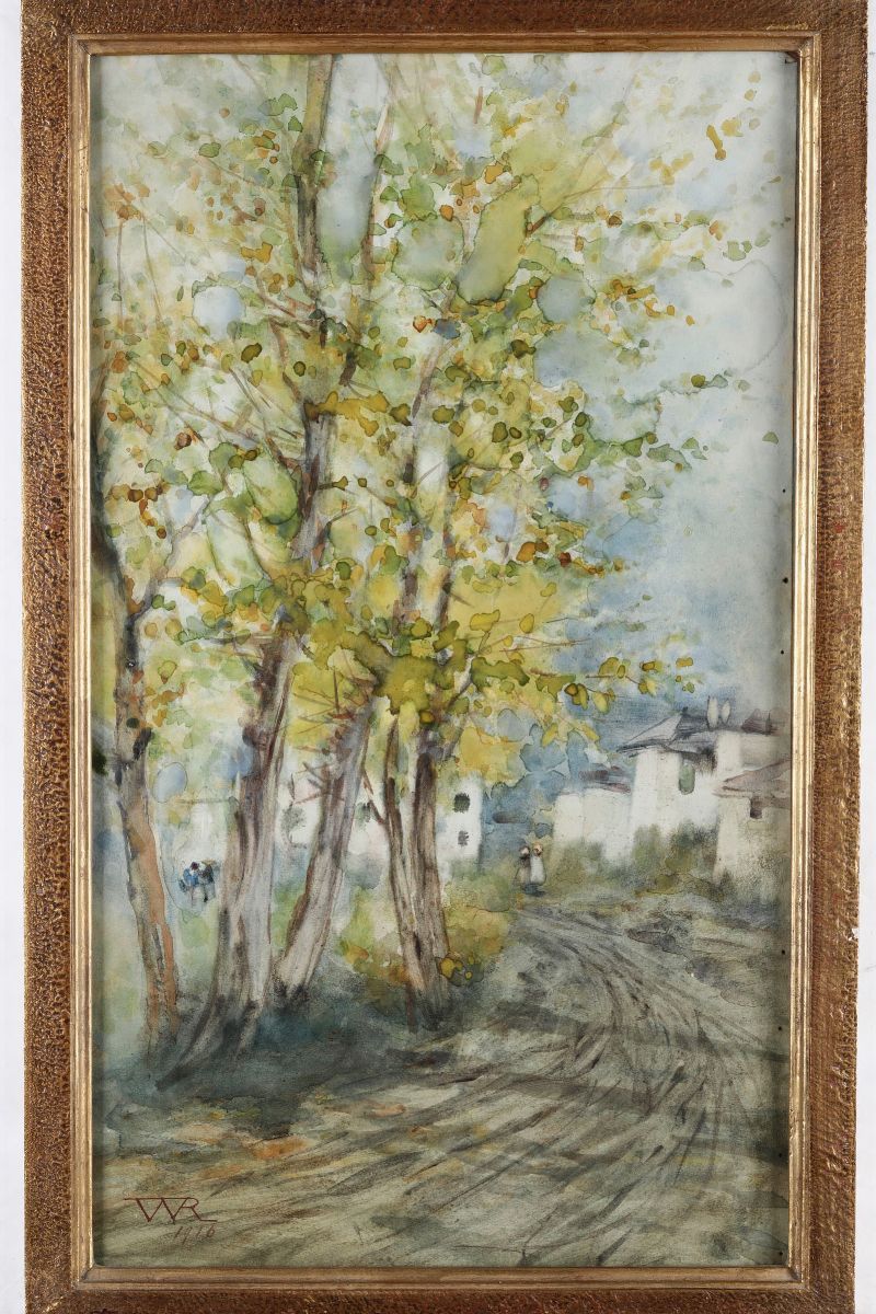 Pittore del XX secolo Viale alberato con figure