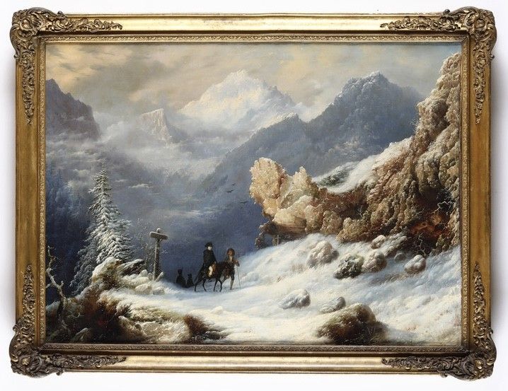 Scuola del XIX secolo Napoleone che valica un passo innevato