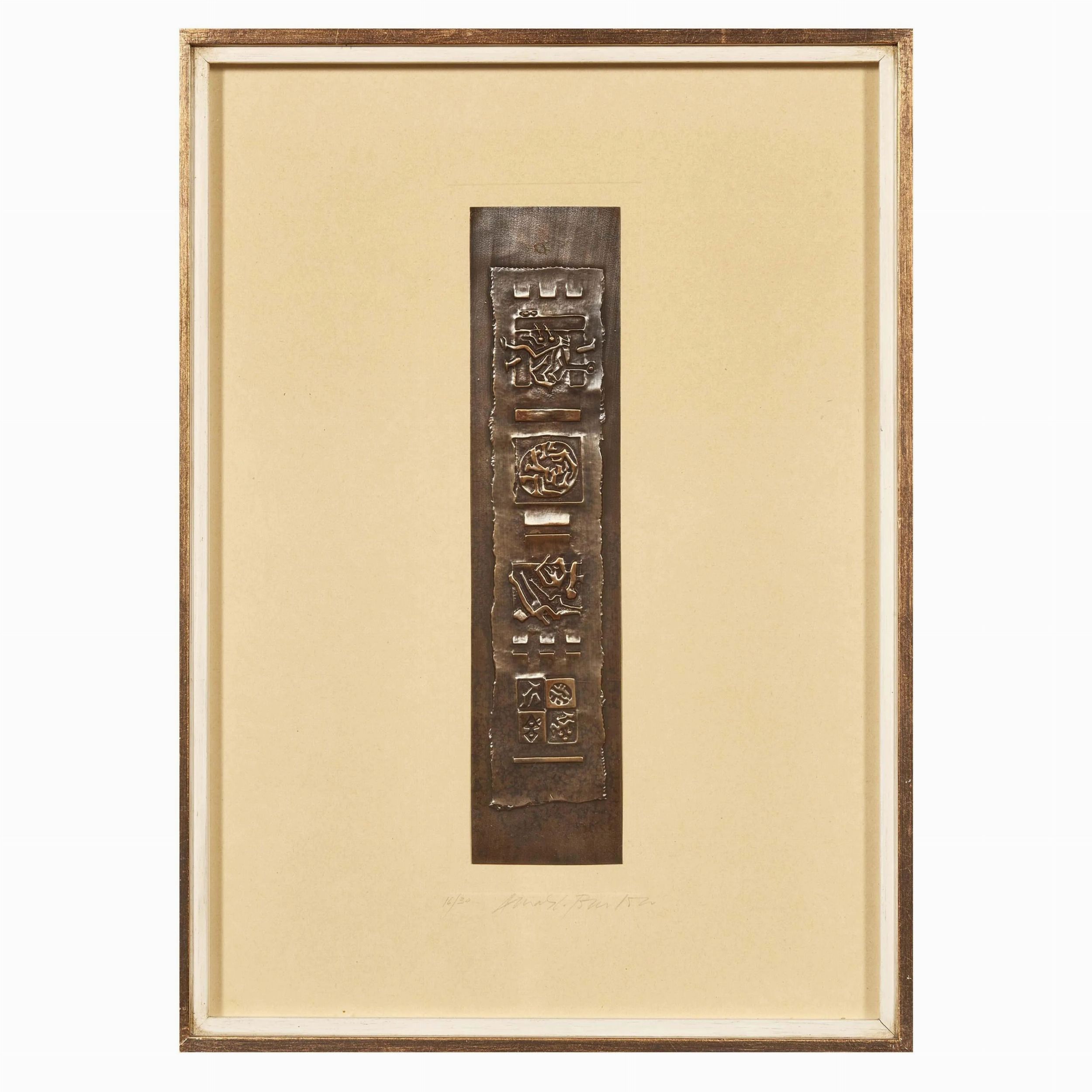 ARNALDO POMODORO (Morciano di Romagna 1926) Senza titolo 2002 calcografia su rame ossidato applicata su cartoncino cm 27×6,5 (cartoncino cm 40×28) esemplare 18/30 firmato e numerato al margine inferiore Arte 3 di Alberto Serighelli, Milano
