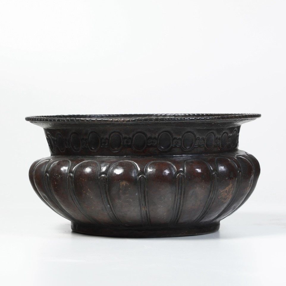 Colonna in ceramica (?) con cachepot in rame sbalzato