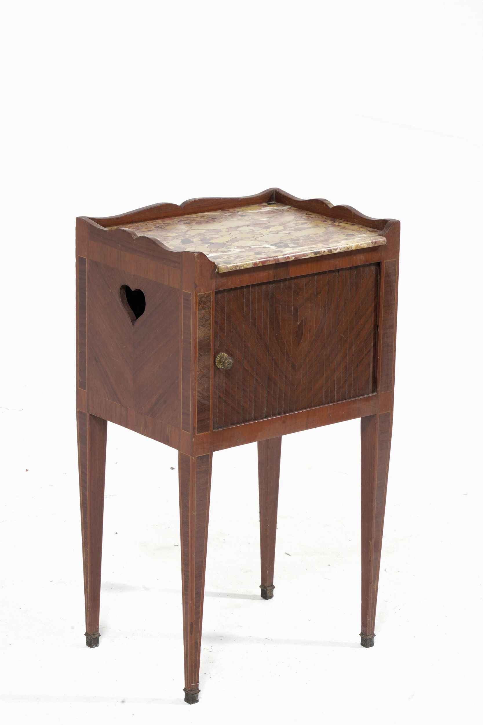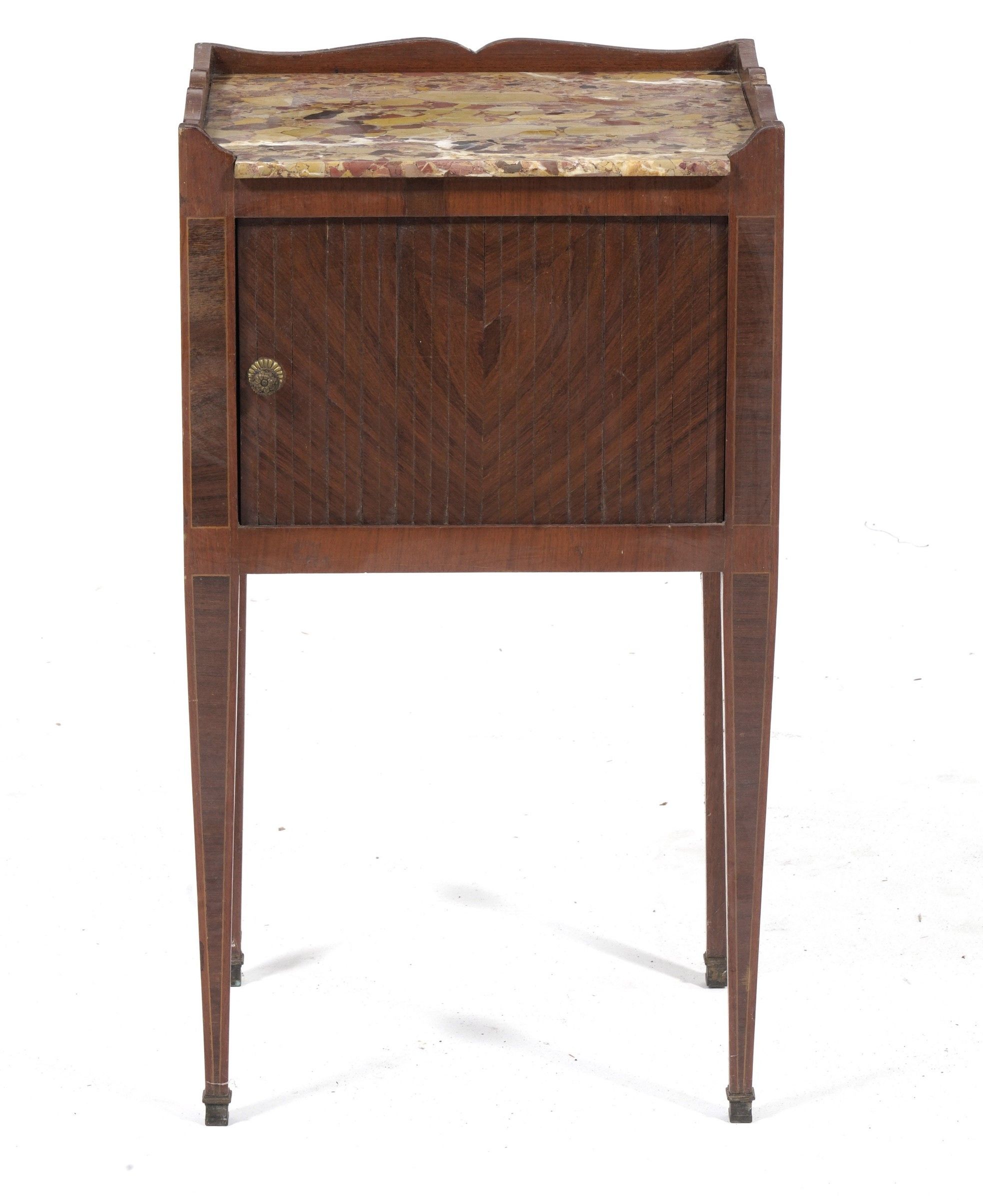 Comodino lastronato e filettato ad un'anta scorrevole. XIX secolo