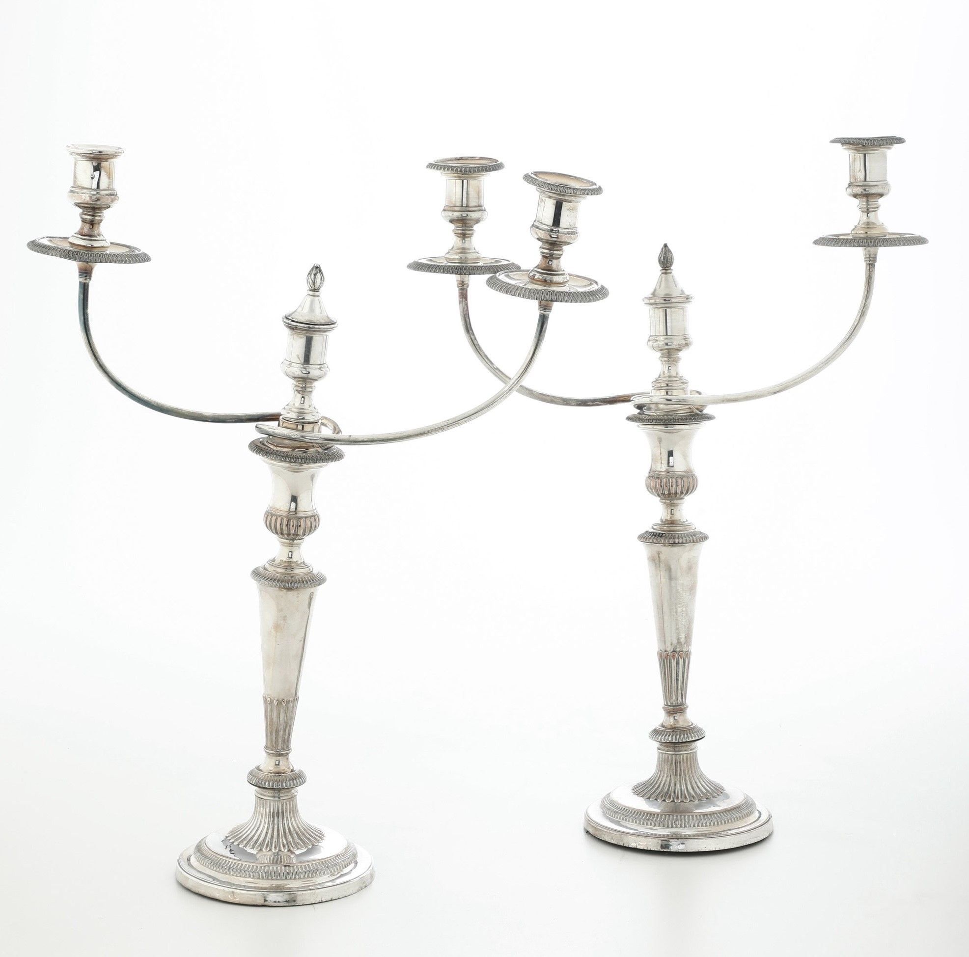 Coppia candelieri a due fiamme in metallo. XX secolo