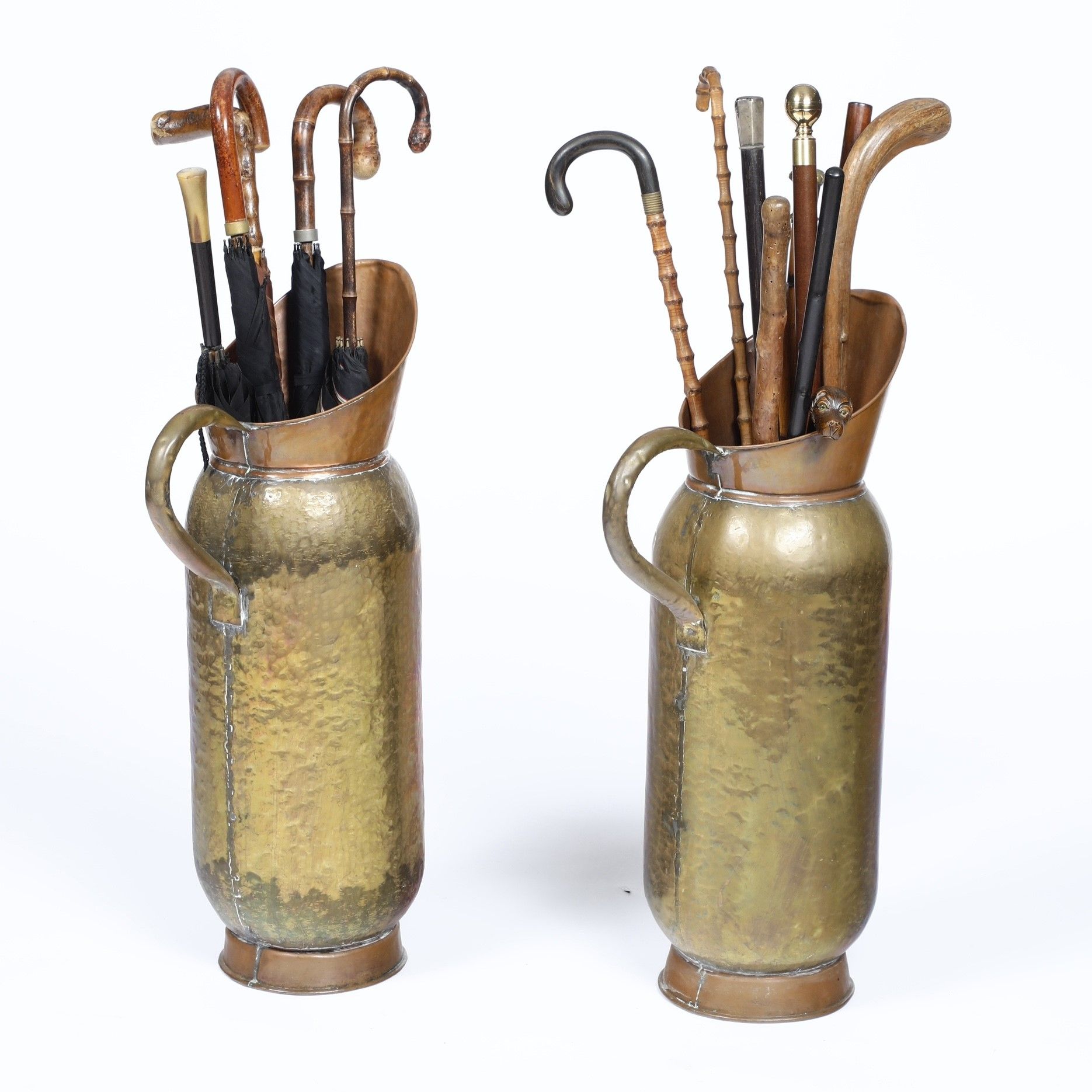 Coppia contenitori rurali per il latte in rame contenenti bastoni
