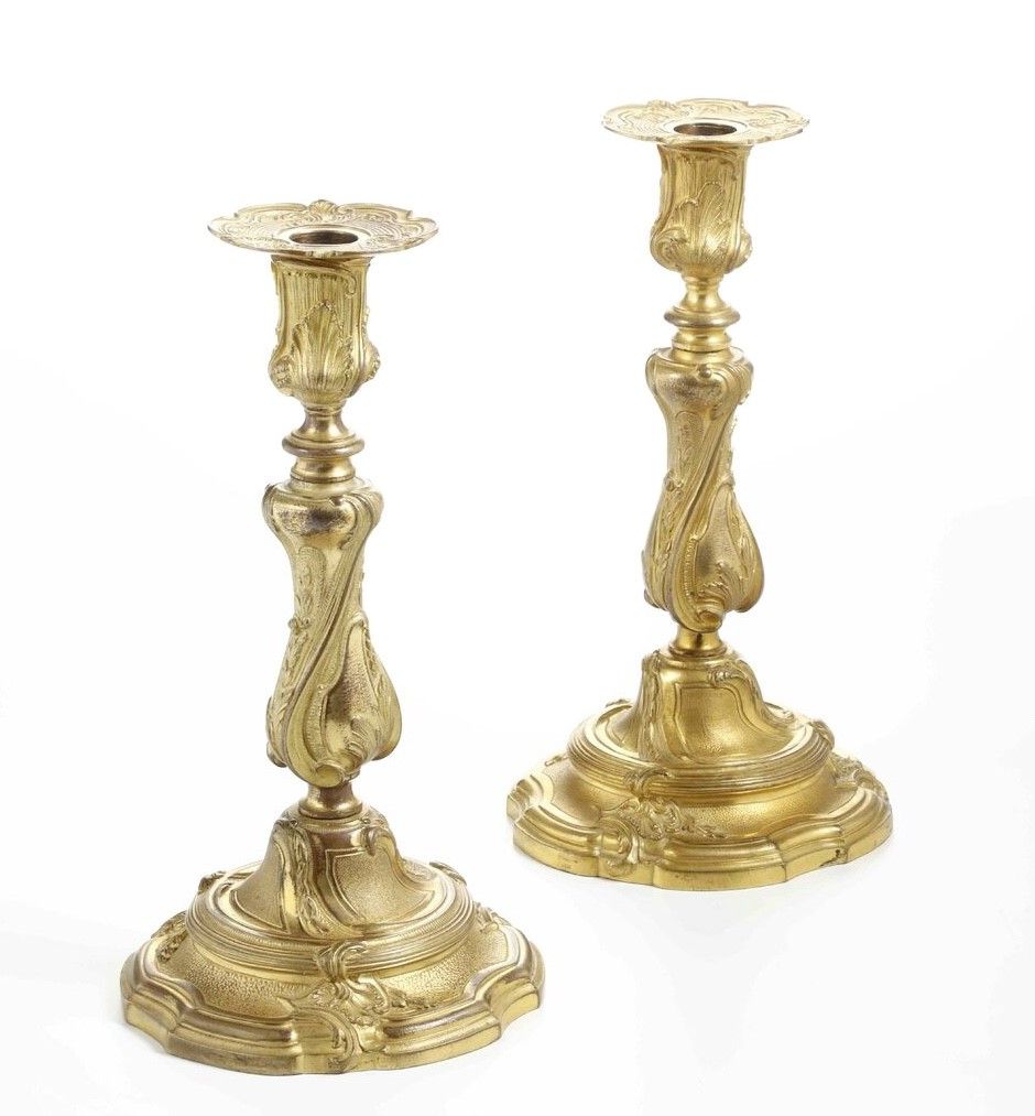 Coppia di candelieri in bronzo dorato, XIX secolo