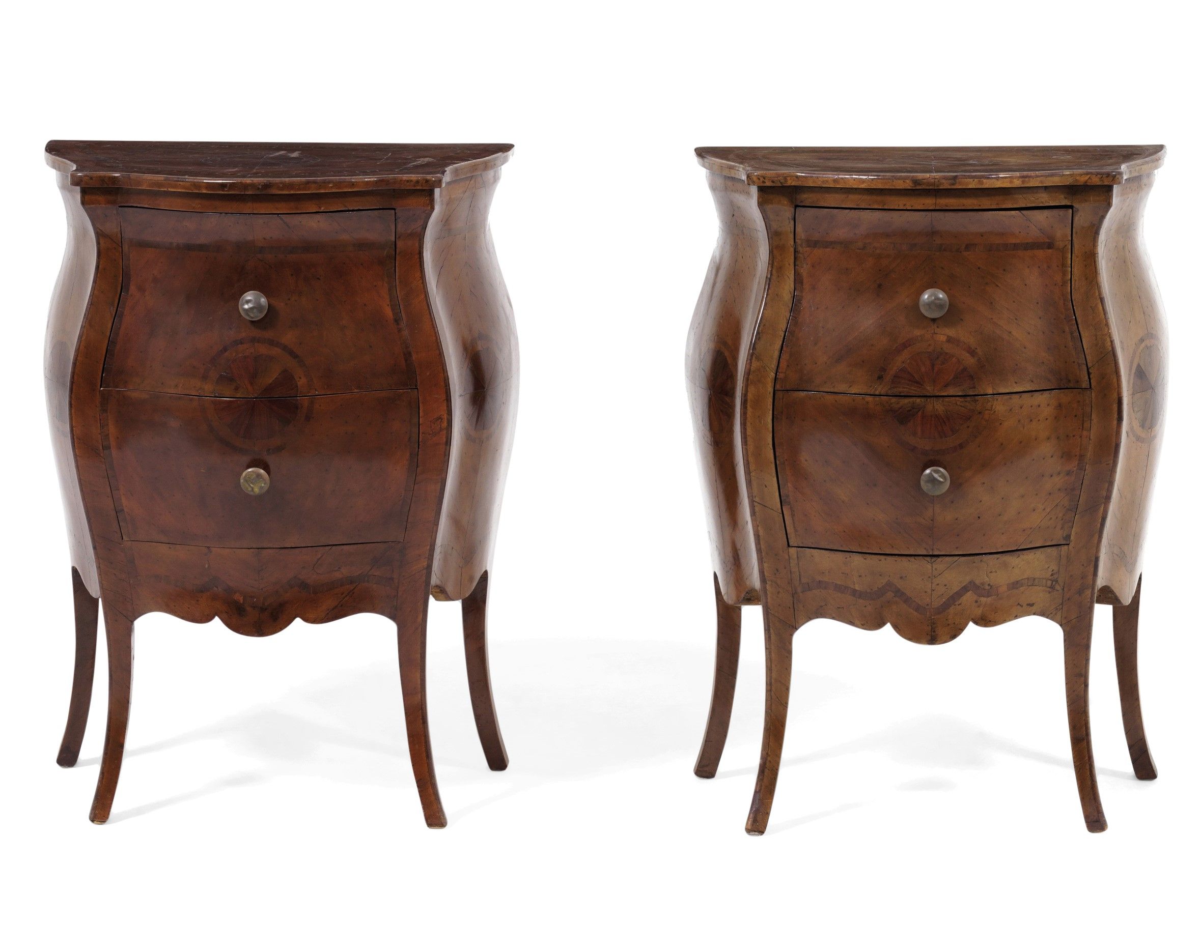 Coppia di comodini di forma mossa lastronati e filettati, in stile