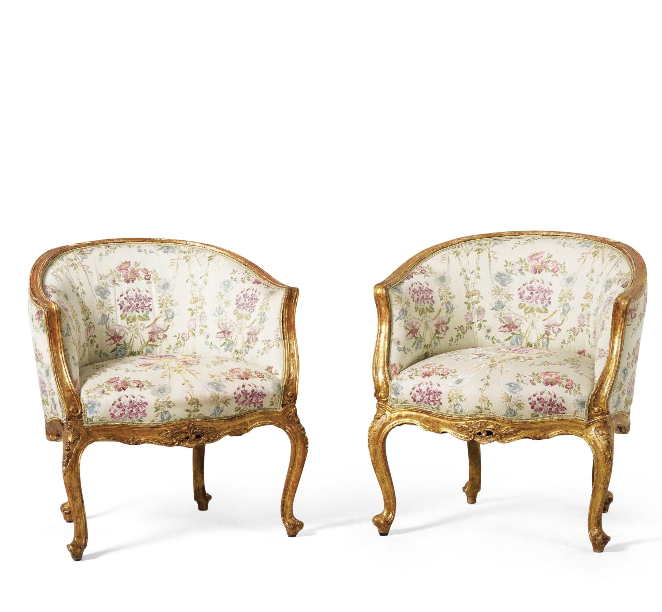 Coppia di poltrone a pozzetto in legno intagliato e dorato. XVIII-XIX secolo